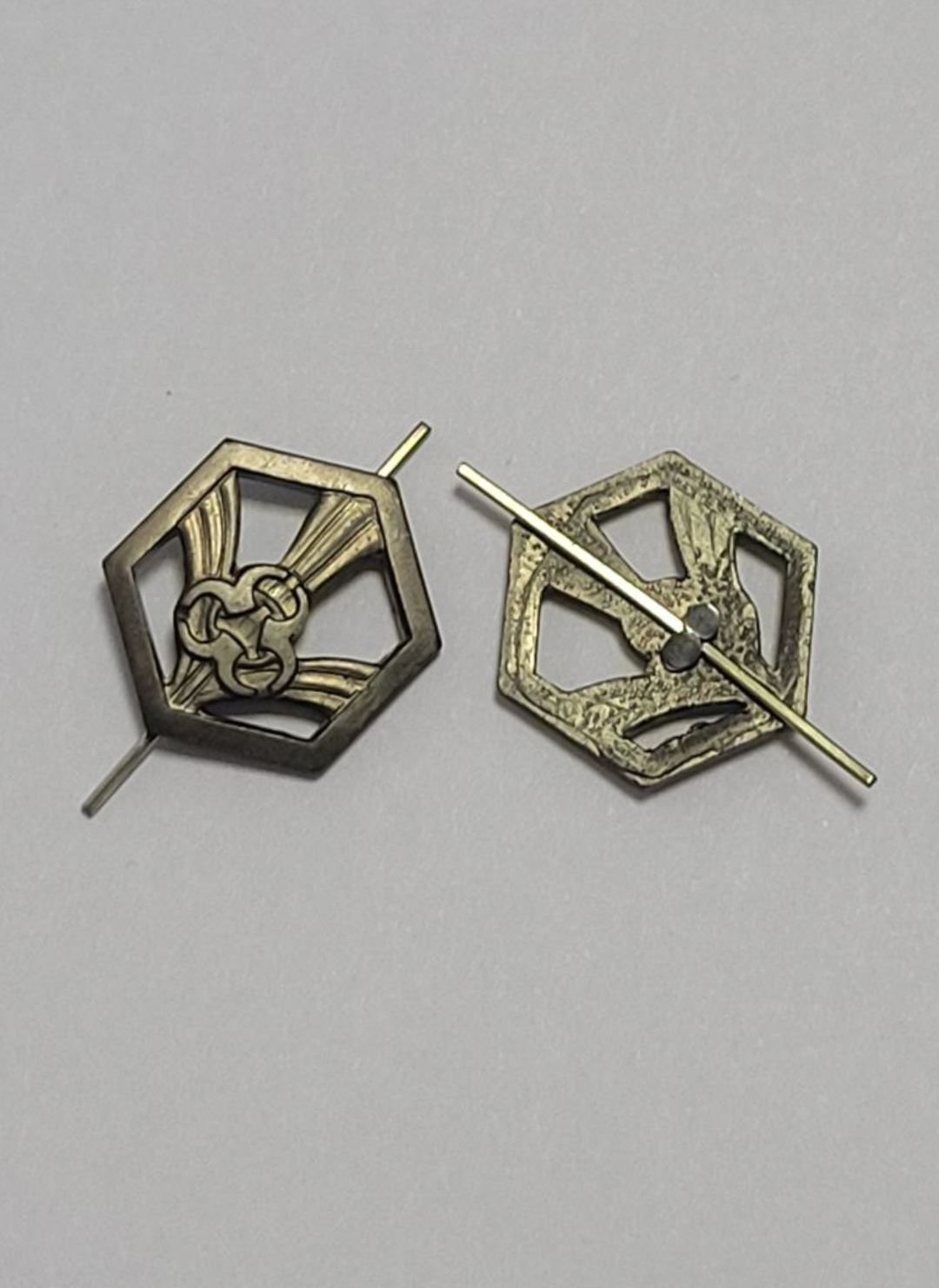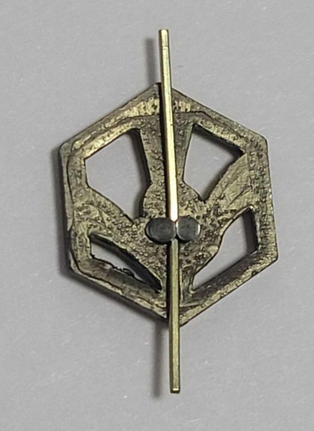 Изображение контурного  правильного шестиугольника с тремя расходящимися лучами золотистого цвета, разделенные пустотами, в нижней части - четыре взаимопересеченных кольца красного цвета. Крепление - усики.