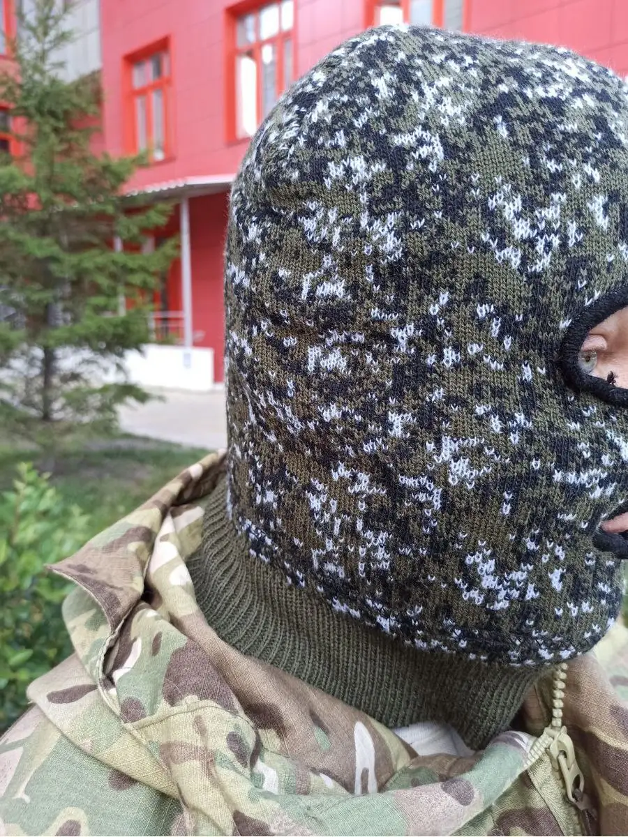 Универсальная шапка, маска балаклава на флисе. Текстильный головной убор камуфляжного, зеленого (зеленая цифра) цвета полностью закрывает голову и шею, оставляя открытыми только глаза и рот, практически полностью исключают узнаваемость. Балаклава тактическая создана для защиты лица от обморожения в условиях аномально низких температур и надежной ветрозащиты. Материал полушерсть, двойной вязки. Шапка, утепленная с внутренней стороны флисом, по низу оформлена широкой резинкой. Приятная на ощупь, не раздражает кожу лица и шеи, гипоаллергенная. Размер универсальный. Подходит мужчинам и женщинам, унисекс. Вязаная балаклава обладает высокими теплосберегающими свойствами, заменяет шапку и шарф-снуд. Защитный аксессуар надевают для активностей в холодное время года: прогулок, езды на снегоходе, катании на сноуборде, лыжах и коньках. А также для зимней рыбалки и охоты, туризма. Балаклава зимняя мужская универсальная, комфортна под военным армейским шлемом или каской. Шапку используют силовые структуры при спецоперациях. Отверстия в маске обеспечивают удобное дыхание, возможность сделать глоток воды или перекусить, не ограничивает и не искажает речь.