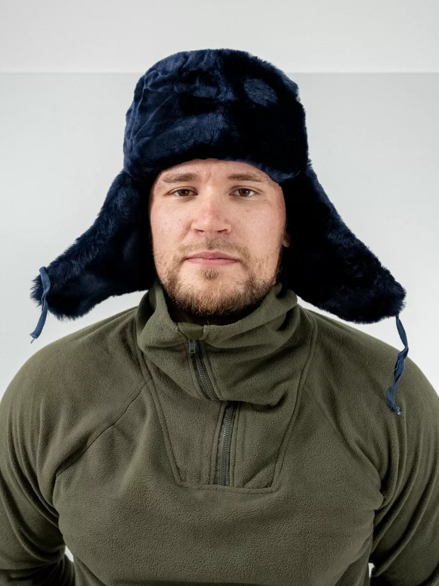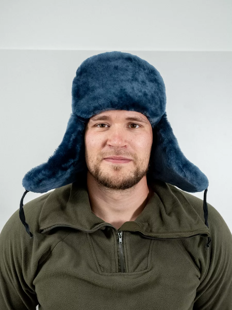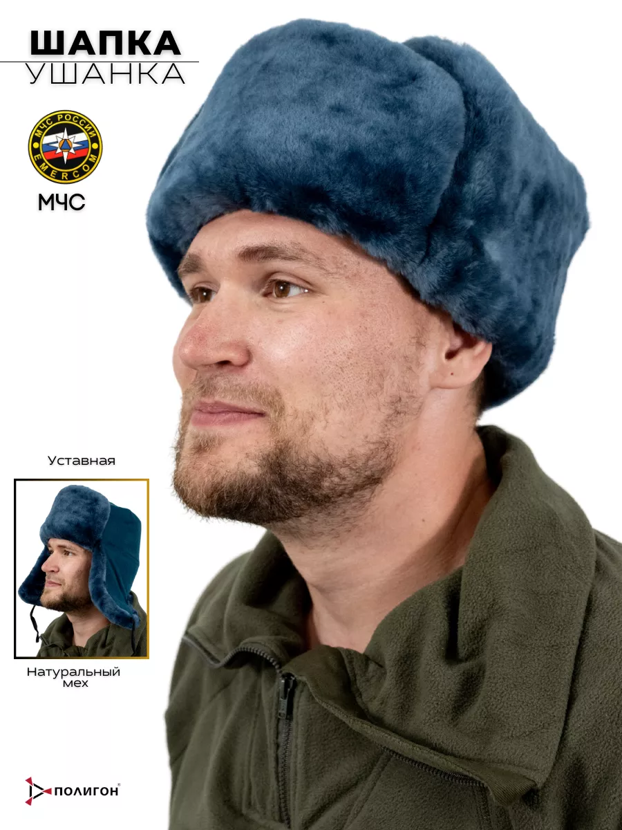 Шапка-ушанка МЧС, изготовлена из меховой овчины, крашеной в серо-голубой цвет, в комбинации с сукном серо-голубого цвета на утепляющей подкладке. Состоит из четырехклинного колпака, козырька и наушников с назатыльником из сукна, на концах наушников имеется тесьма для завязывания. Лицевые детали козырька, наушников и назатыльников изготовлены из меховой овчины.
