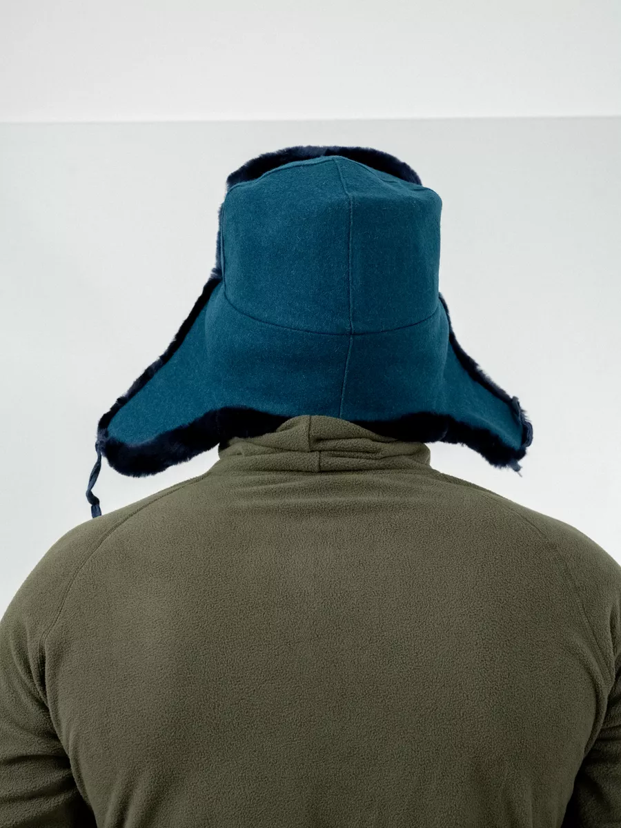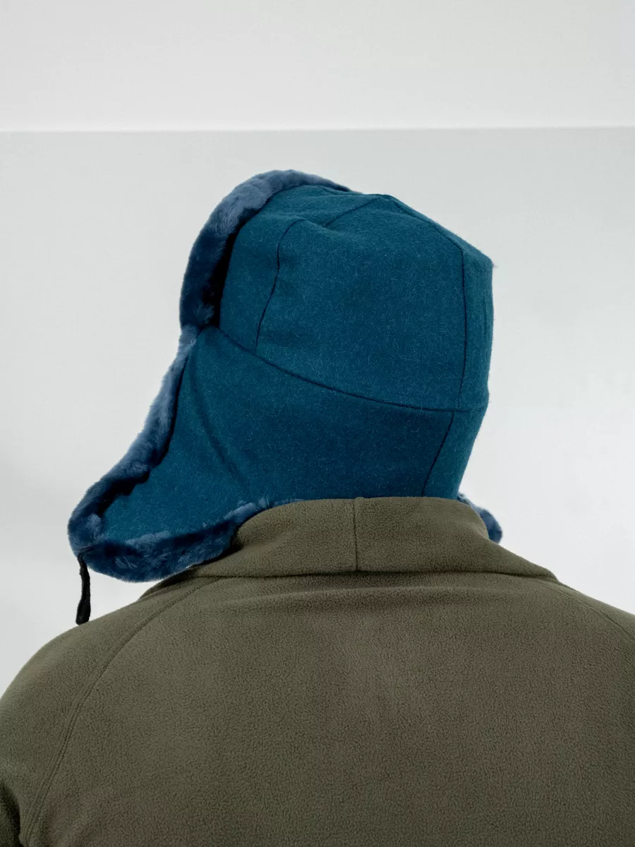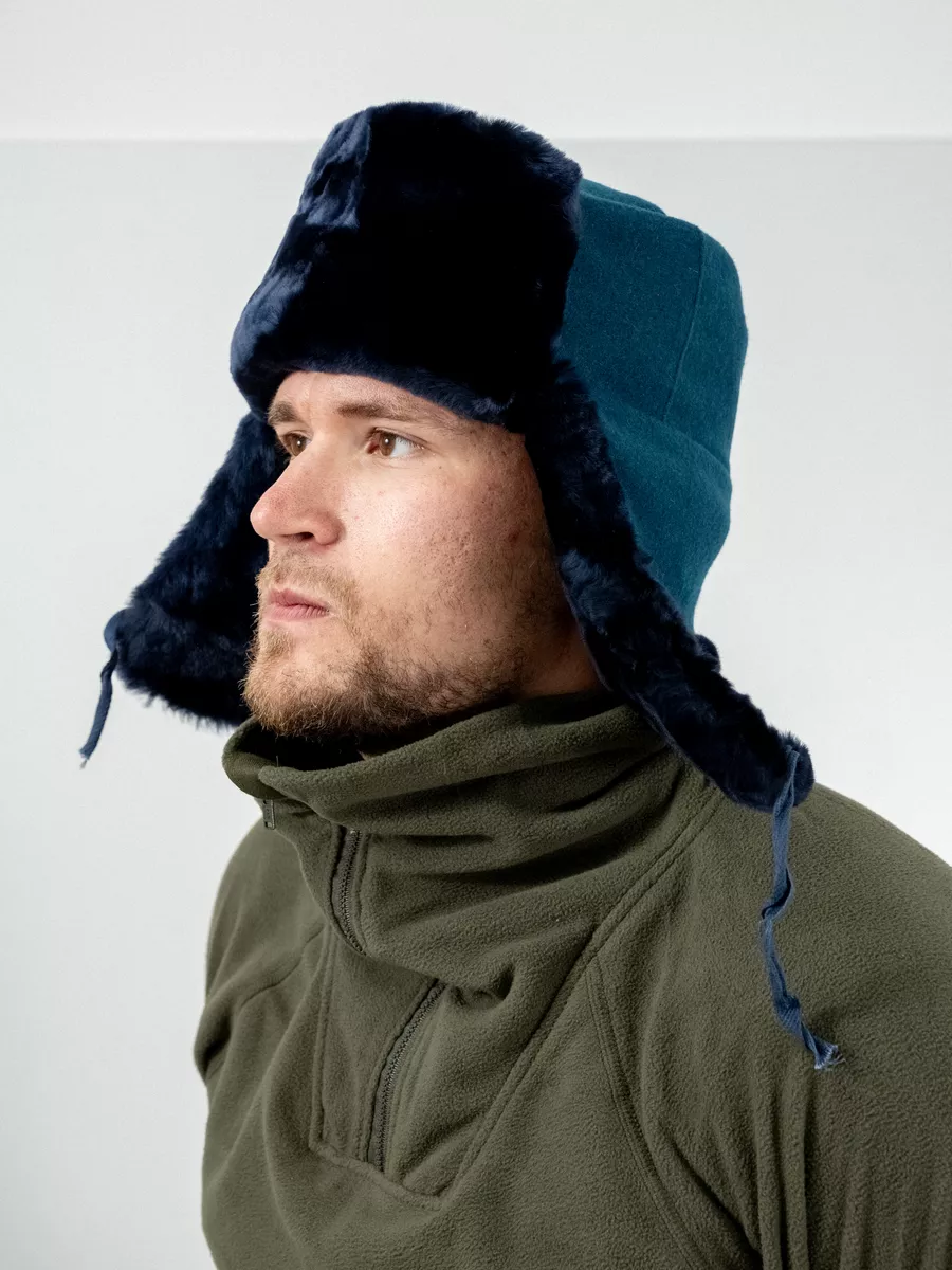 Шапка-ушанка МЧС, изготовлена из меховой овчины, крашеной в серо-голубой цвет, в комбинации с сукном серо-голубого цвета на утепляющей подкладке. Состоит из четырехклинного колпака, козырька и наушников с назатыльником из сукна, на концах наушников имеется тесьма для завязывания. Лицевые детали козырька, наушников и назатыльников изготовлены из меховой овчины.