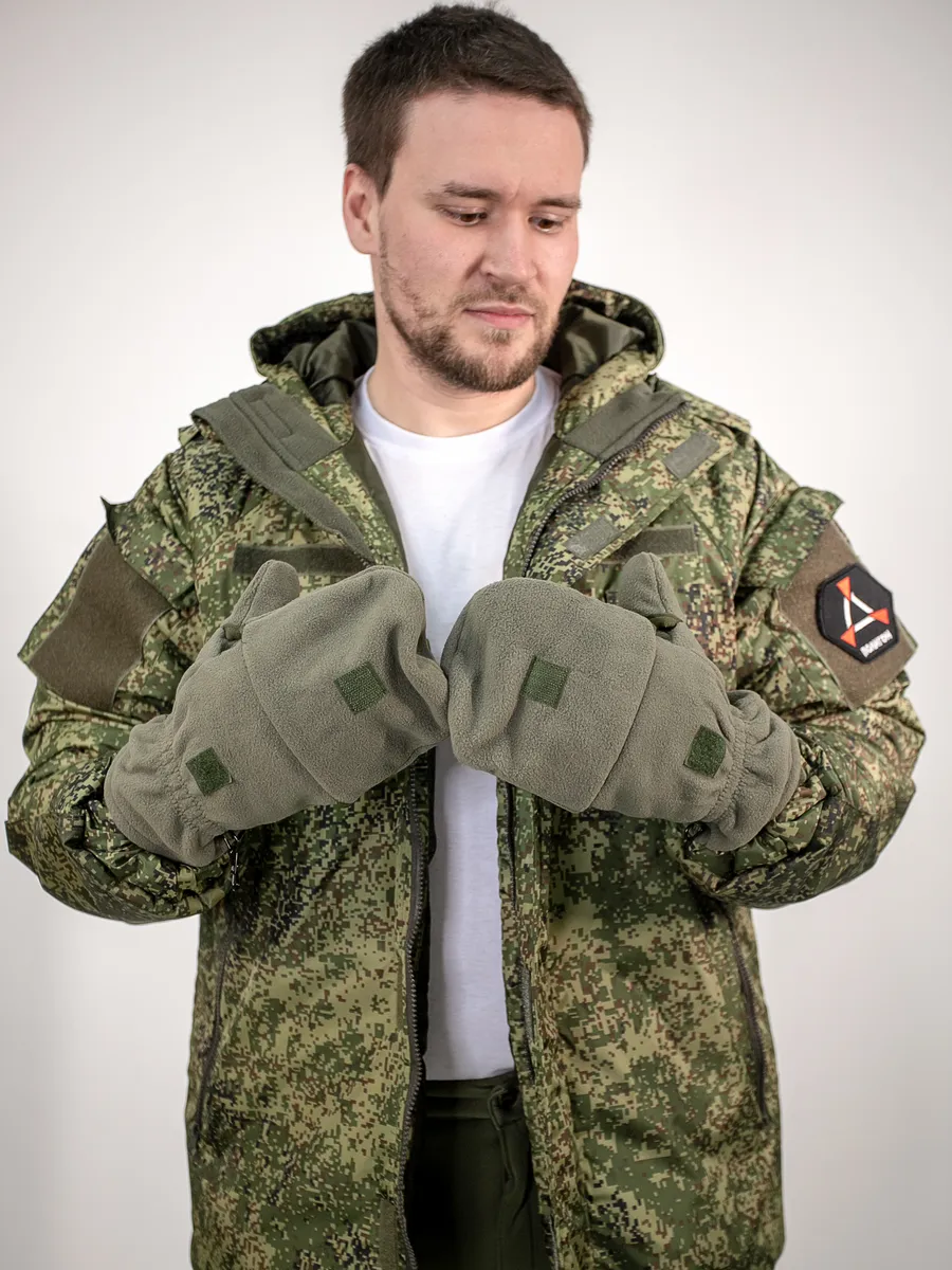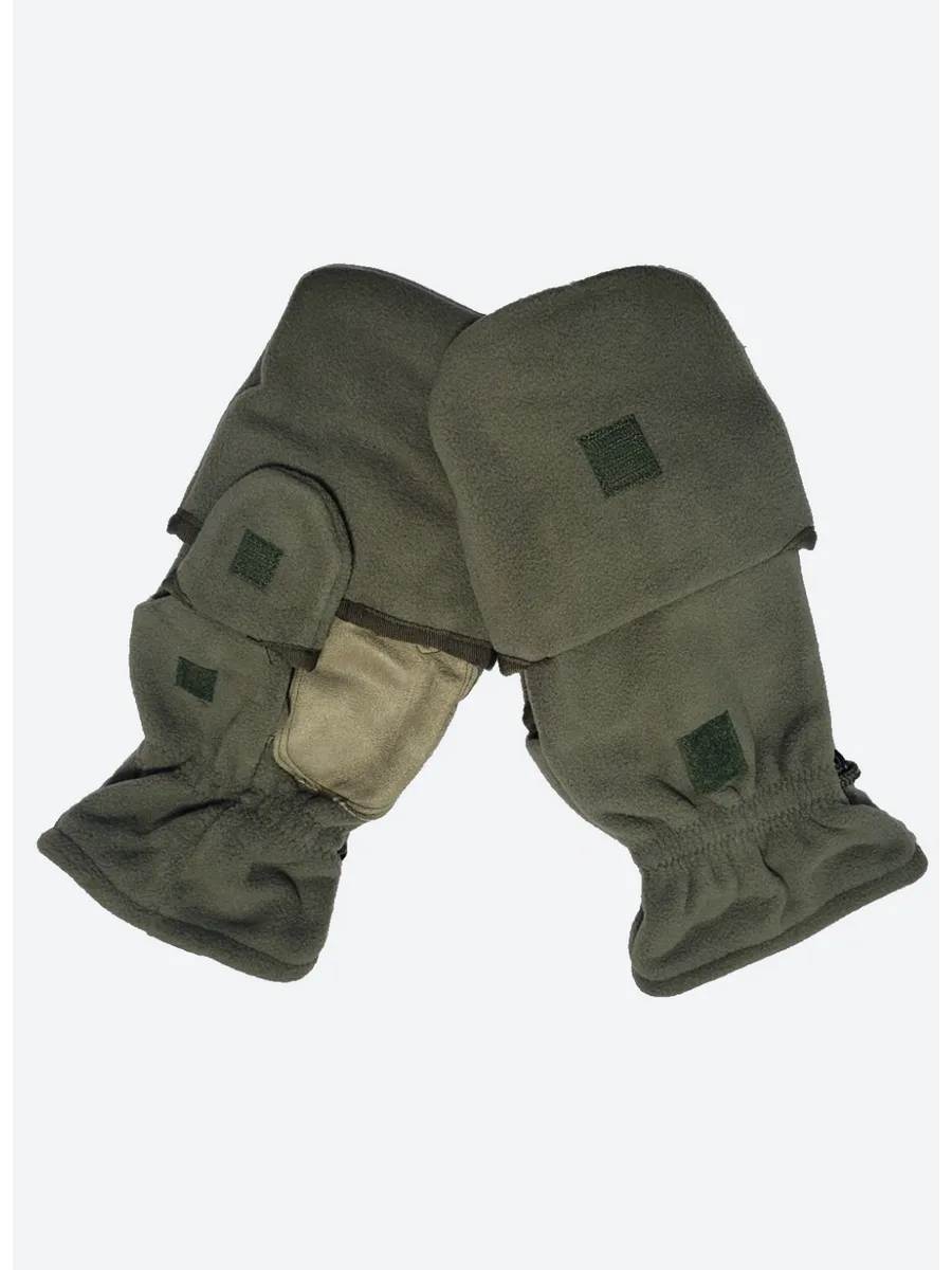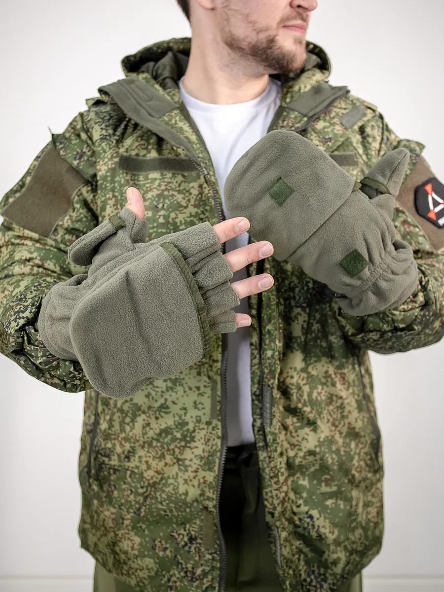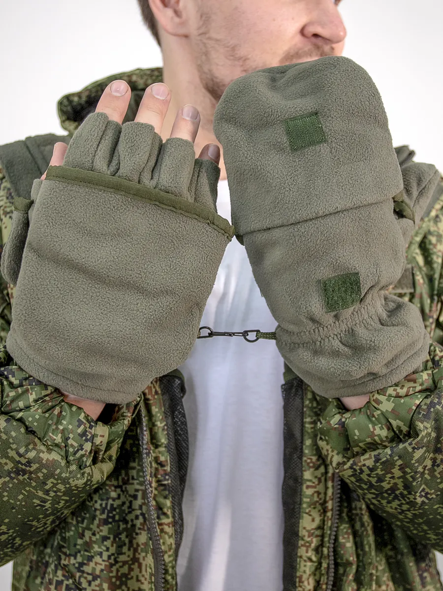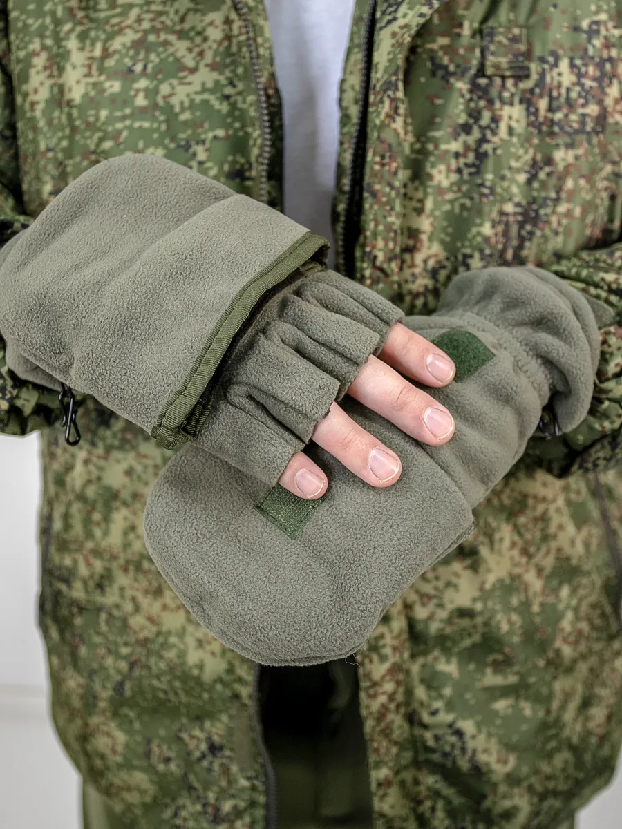 Армейские варежки утепленные изготовлены из трехслойной ткани типа "виндблок" - двух слоев флиса с мембраной между ними, которая защищает от ветра, но выводит наружу избыточную влагу (пот), наладонник - искусственная износостойкая замша для уменьшения скольжения. Имеют базовую часть в виде перчаток с открытыми пальцами для работы и теплого клапана-варежки для защиты пальцев. В открытом состоянии клапан фиксируется на внешней стороне липучкой. Модель с откидным верхом предназначена для защиты рук в холодное время года (но не обеспечивают полную защиту при низких температурах).