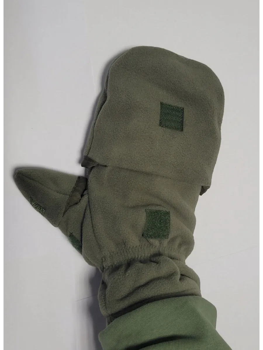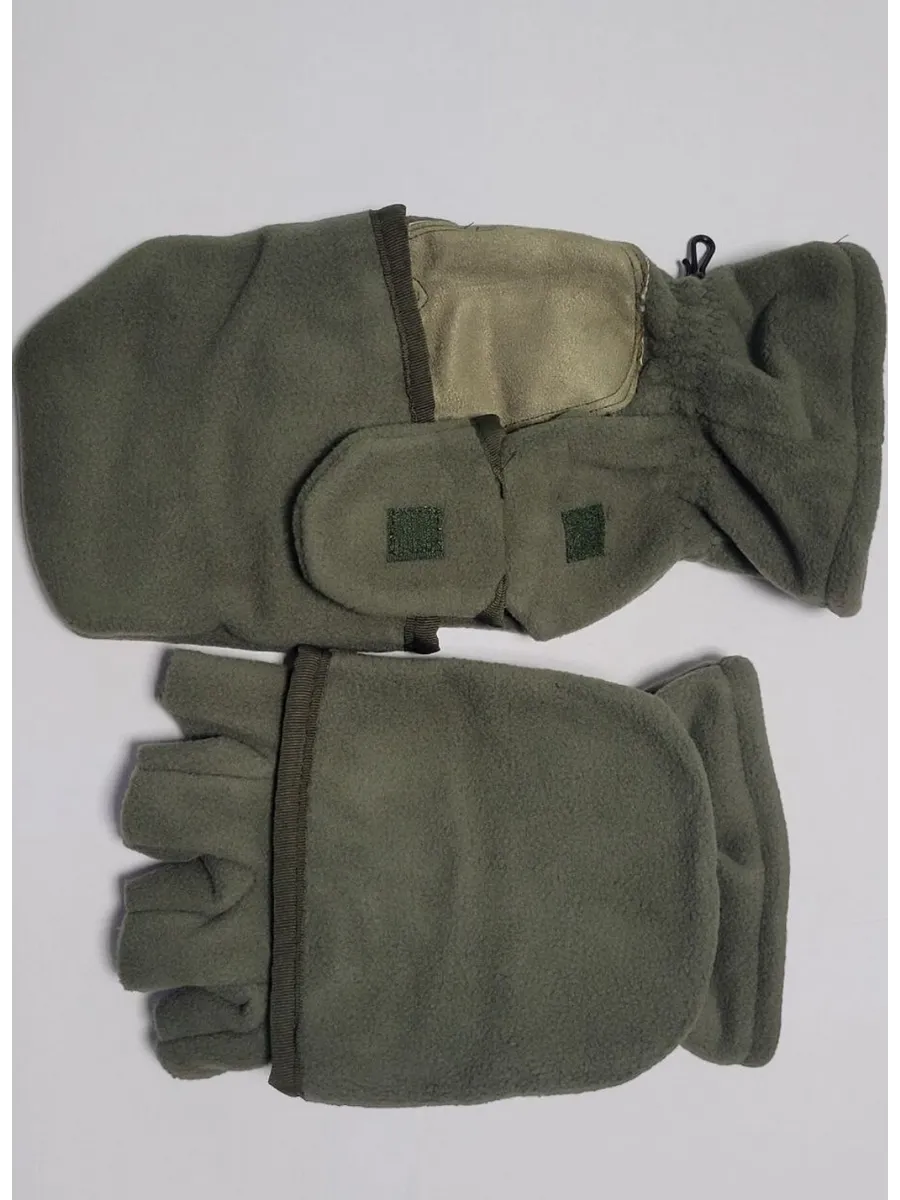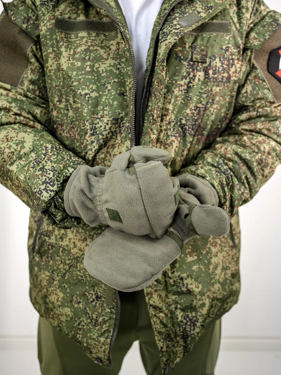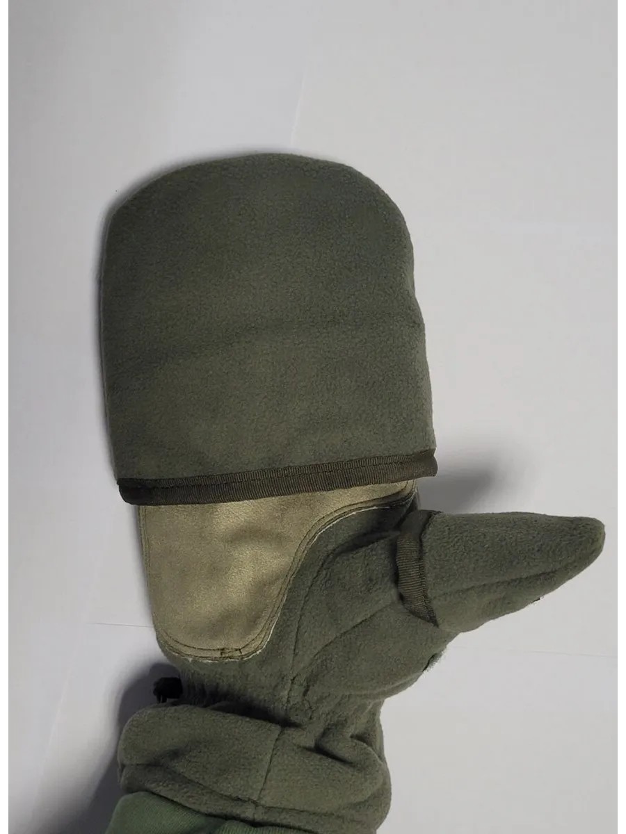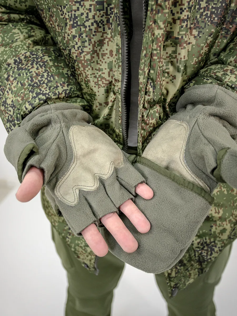Армейские варежки утепленные изготовлены из трехслойной ткани типа "виндблок" - двух слоев флиса с мембраной между ними, которая защищает от ветра, но выводит наружу избыточную влагу (пот), наладонник - искусственная износостойкая замша для уменьшения скольжения. Имеют базовую часть в виде перчаток с открытыми пальцами для работы и теплого клапана-варежки для защиты пальцев. В открытом состоянии клапан фиксируется на внешней стороне липучкой. Модель с откидным верхом предназначена для защиты рук в холодное время года (но не обеспечивают полную защиту при низких температурах).