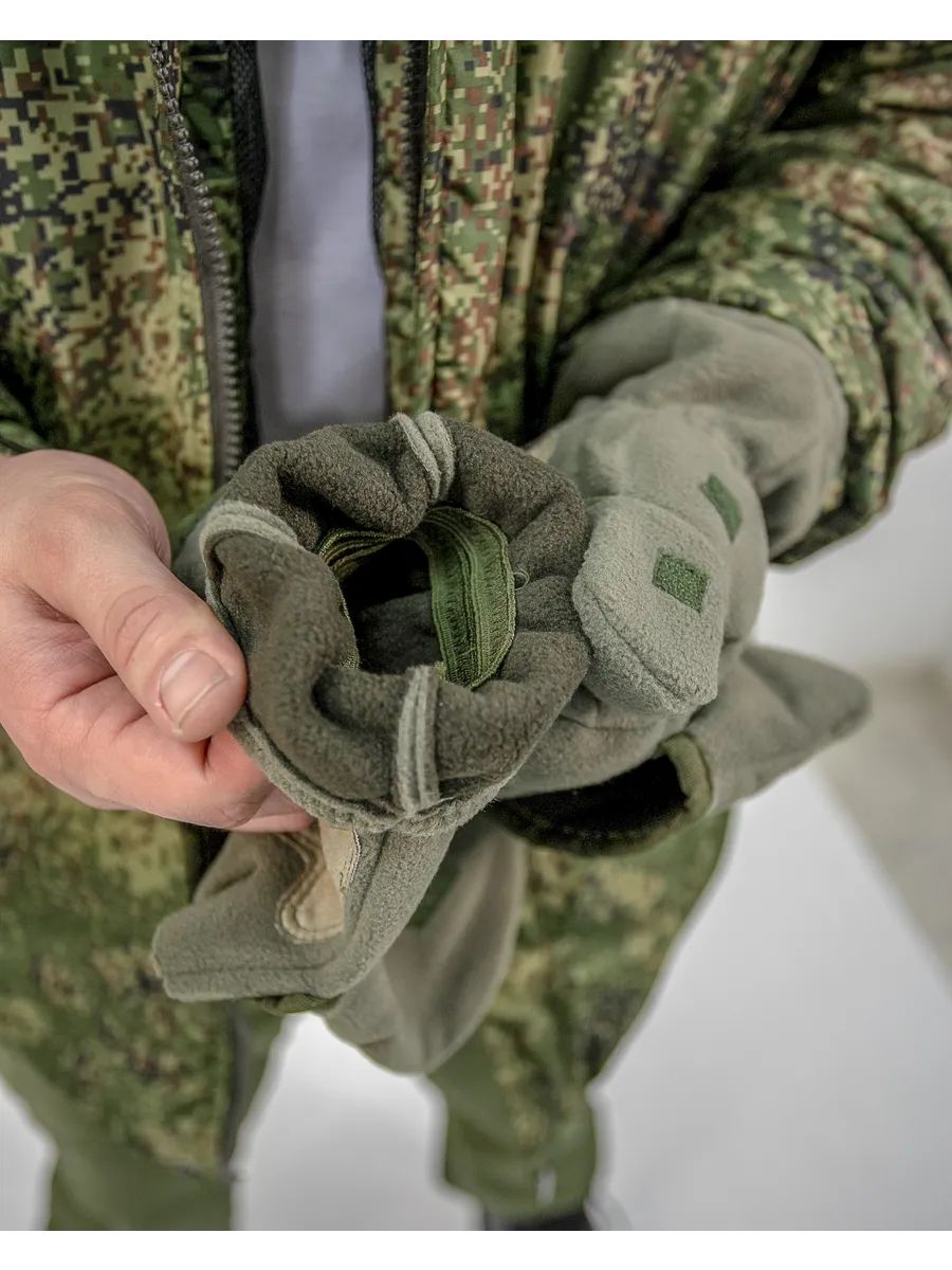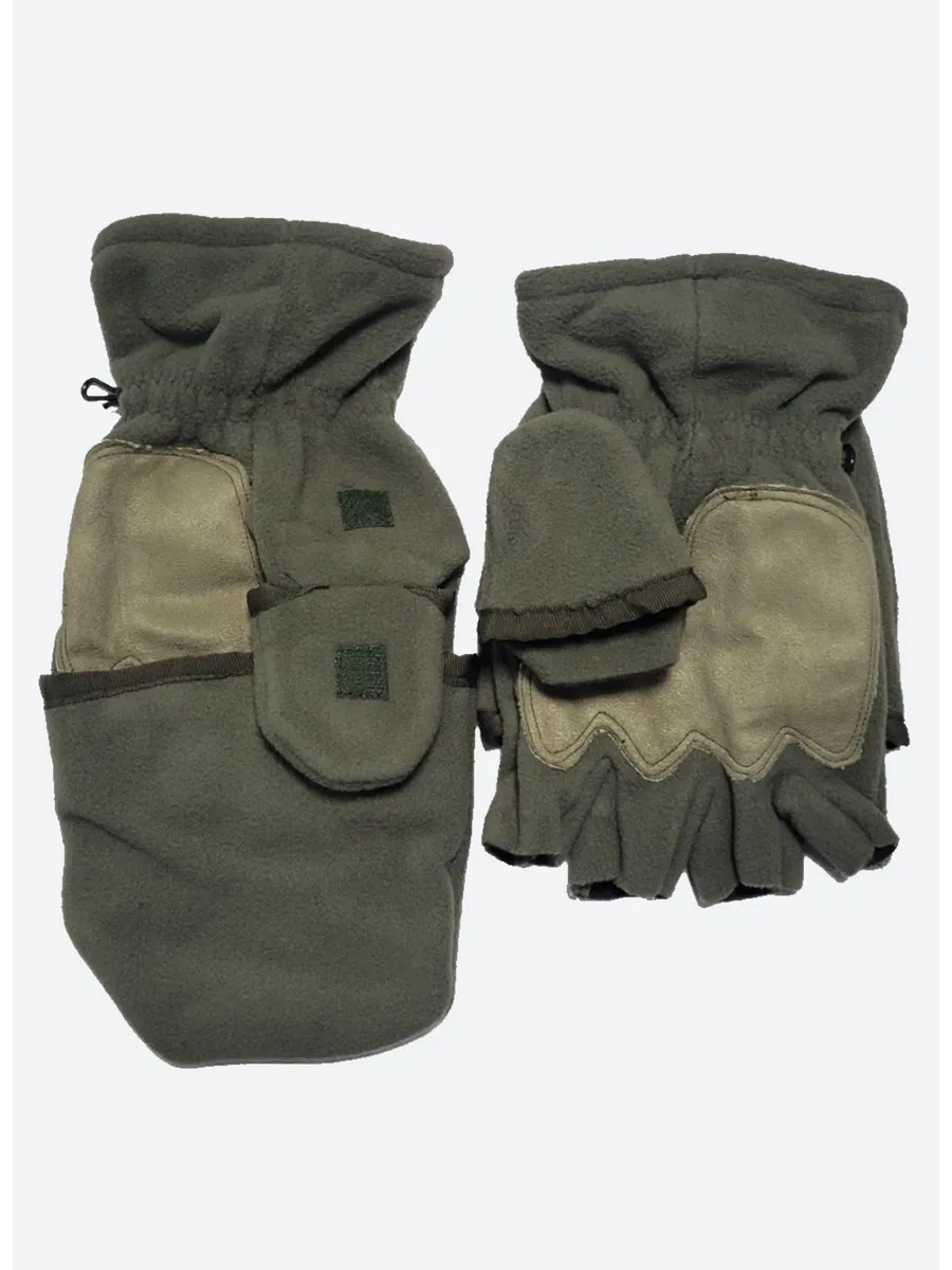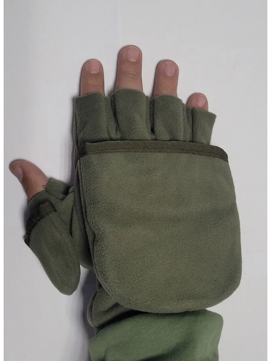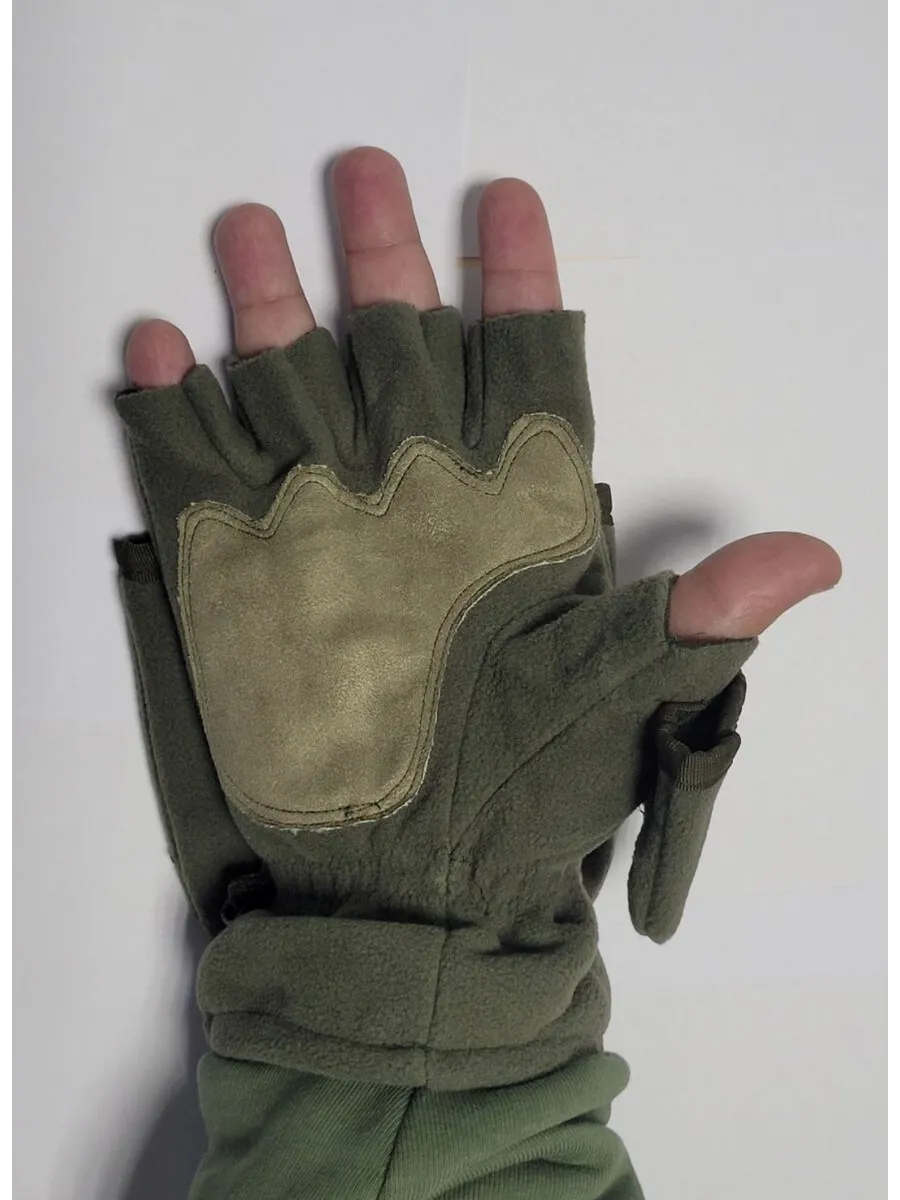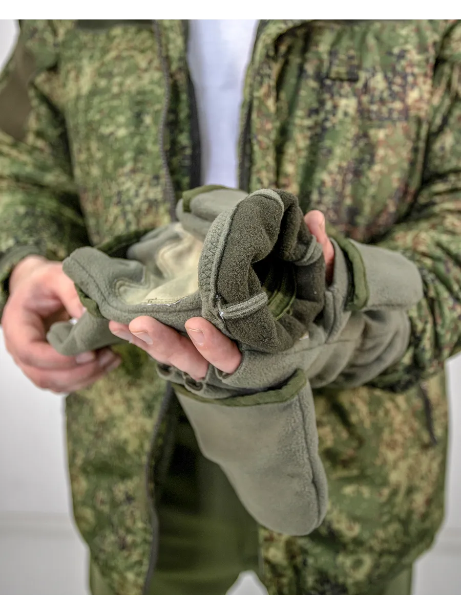 Армейские варежки утепленные изготовлены из трехслойной ткани типа "виндблок" - двух слоев флиса с мембраной между ними, которая защищает от ветра, но выводит наружу избыточную влагу (пот), наладонник - искусственная износостойкая замша для уменьшения скольжения. Имеют базовую часть в виде перчаток с открытыми пальцами для работы и теплого клапана-варежки для защиты пальцев. В открытом состоянии клапан фиксируется на внешней стороне липучкой. Модель с откидным верхом предназначена для защиты рук в холодное время года (но не обеспечивают полную защиту при низких температурах).