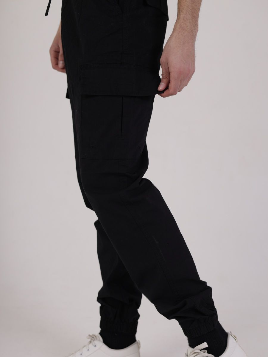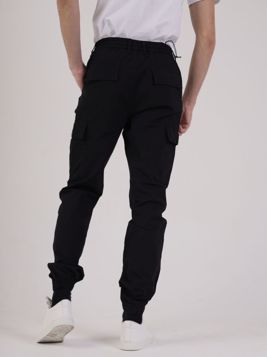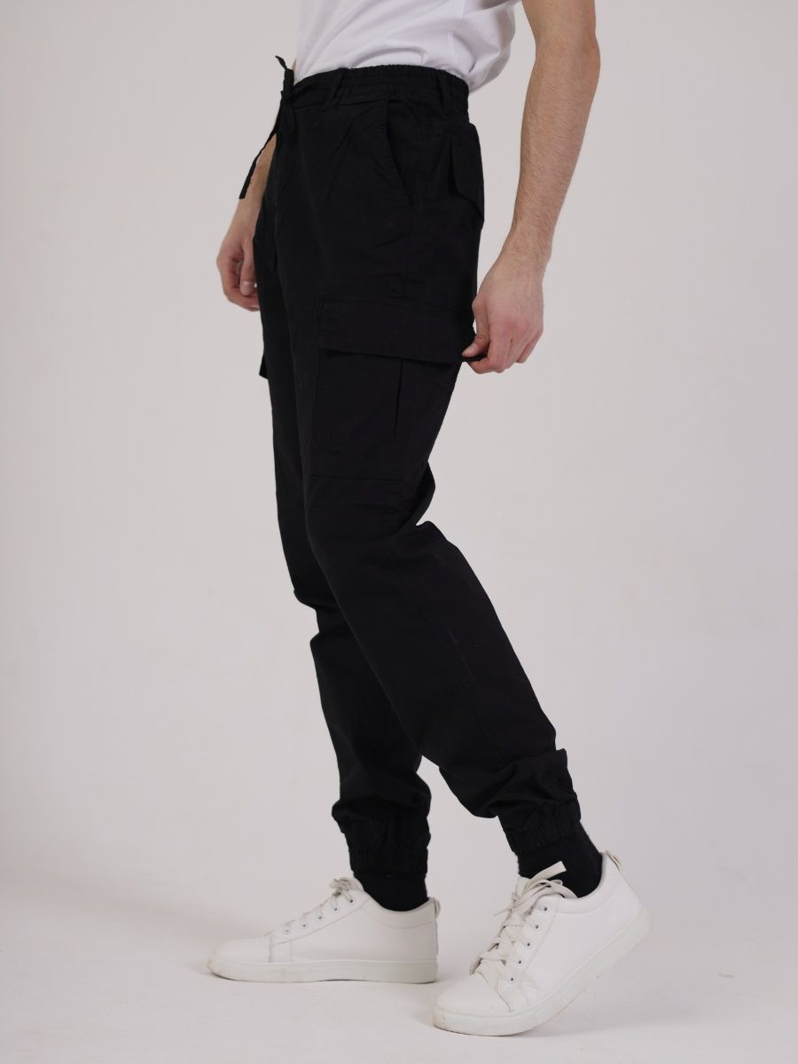 Брюки джоггеры мужские представлены в черном цвете. Джоггеры удачная модель объединившая спортивный стиль с городским. Штаны стильно смотрятся и хорошо сочетаются с футболками, куртками, рубашками. Отлично вписываются у каждого мужчины, женщины, подростка в гардеробе. Материал джоггеров состоит из 97% хлопка, 3% полиэстер. Для различных аксессуаров предусмотрено 6 карманов: 2 прорезных, 2 накладных на бедрах, 2 накладных задних кармана. Все карманы глубокие и функциональные и ими удобно пользоваться. Отличительная черта этих спортивных штанов является резинка на талии, а также манжеты на щиколотках в виде резинки. Благодаря резинкам при необходимости брюки можно легко поднять. Брюки удобно носить с высокими берцами, кроссовками, мокасинами. Коллекцию карго джогерров весна-лето можно увидеть не только на стадионах и в спорт залах, но и на улицах и даже в офисах.