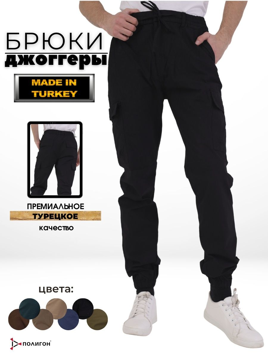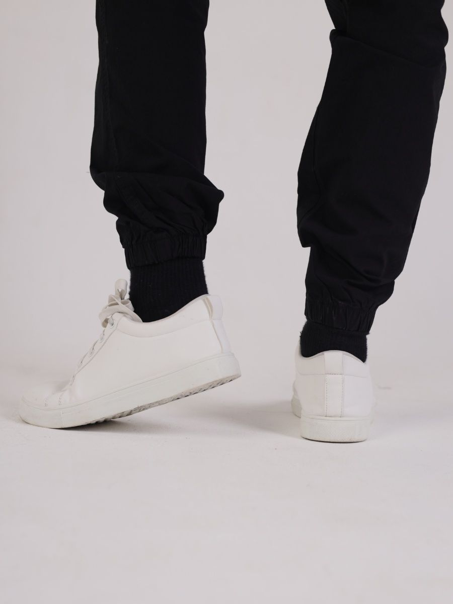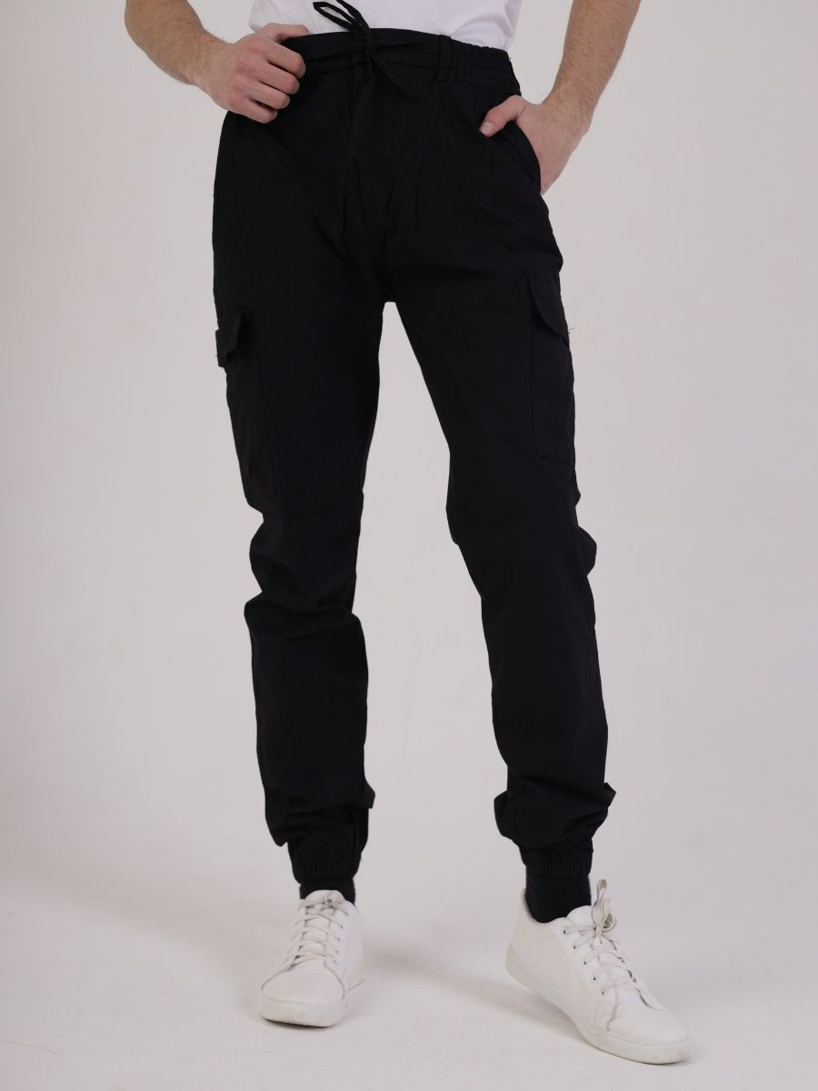 Брюки джоггеры мужские представлены в черном цвете. Джоггеры удачная модель объединившая спортивный стиль с городским. Штаны стильно смотрятся и хорошо сочетаются с футболками, куртками, рубашками. Отлично вписываются у каждого мужчины, женщины, подростка в гардеробе. Материал джоггеров состоит из 97% хлопка, 3% полиэстер. Для различных аксессуаров предусмотрено 6 карманов: 2 прорезных, 2 накладных на бедрах, 2 накладных задних кармана. Все карманы глубокие и функциональные и ими удобно пользоваться. Отличительная черта этих спортивных штанов является резинка на талии, а также манжеты на щиколотках в виде резинки. Благодаря резинкам при необходимости брюки можно легко поднять. Брюки удобно носить с высокими берцами, кроссовками, мокасинами. Коллекцию карго джогерров весна-лето можно увидеть не только на стадионах и в спорт залах, но и на улицах и даже в офисах.