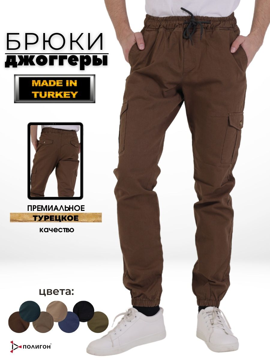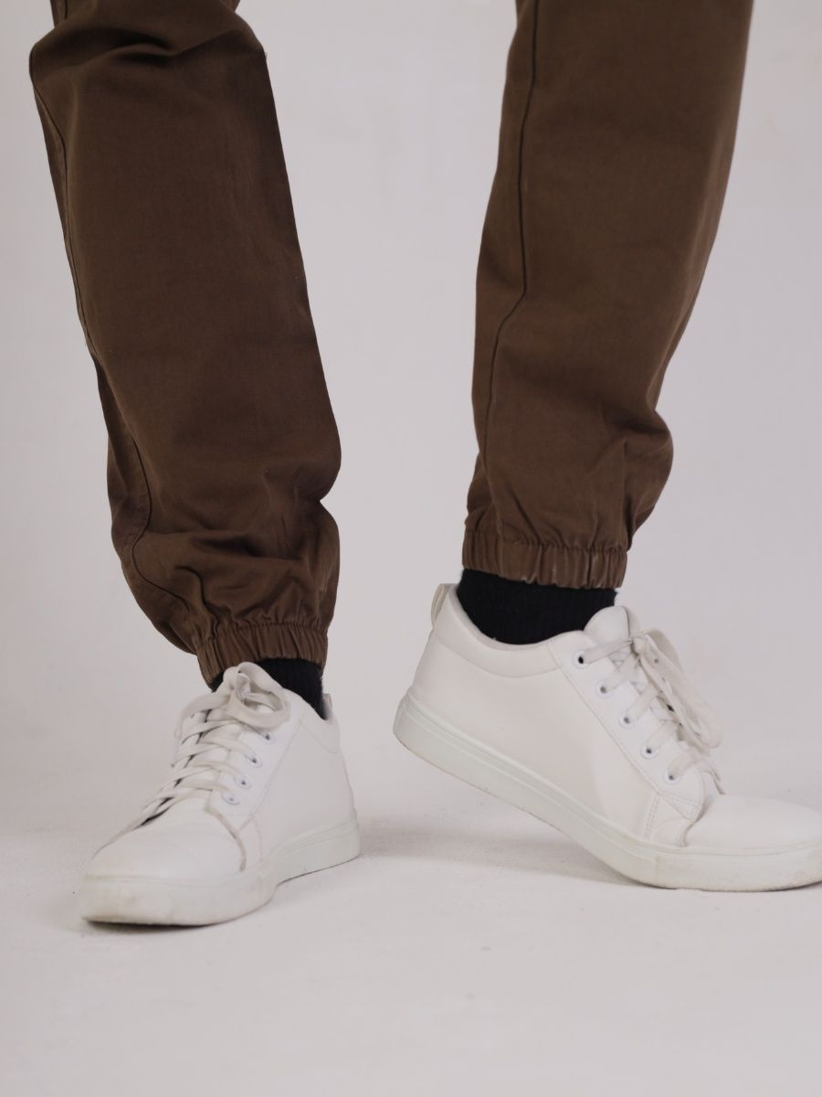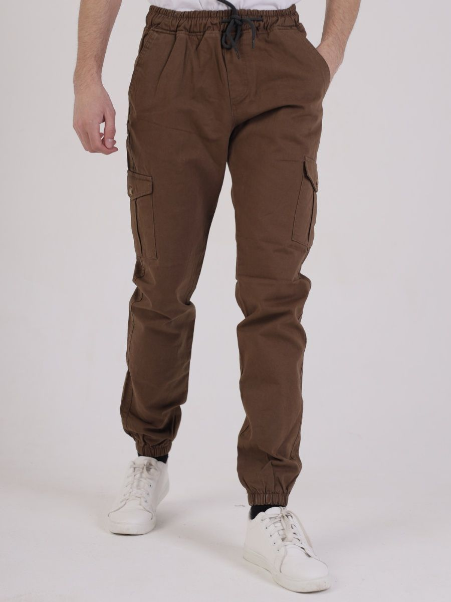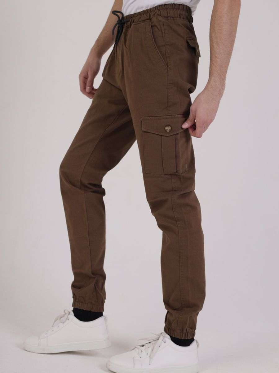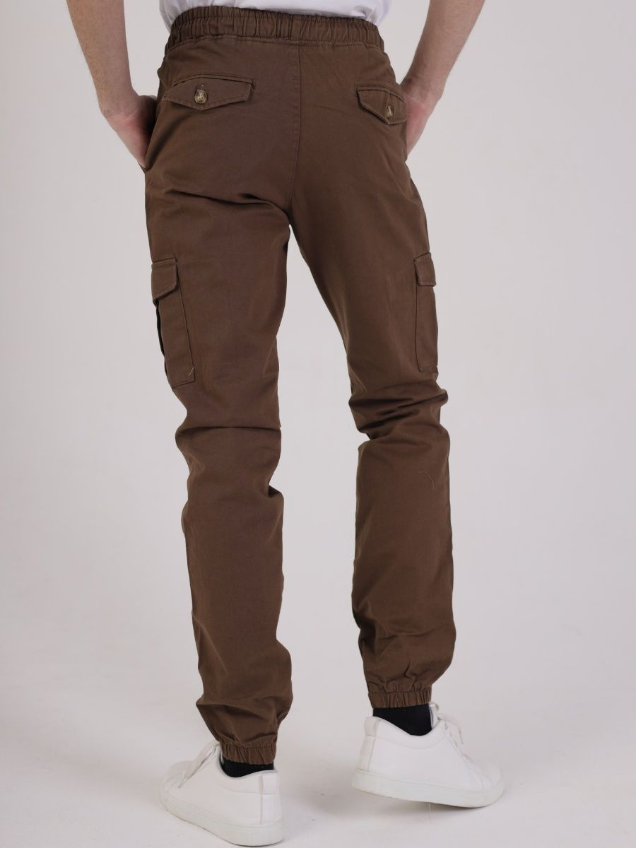 Брюки мужские представлены в коричневом цвете. Джоггеры удачная модель объединившая спортивный стиль с городским. Штаны стильно смотрятся и хорошо сочетаются с футболками, куртками, рубашками. Отлично вписываются у каждого мужчины, женщины, подростка в гардеробе. Материал джоггеров состоит из 97% хлопка, 3% полиэстер. Для различных аксессуаров предусмотрено 6 карманов: 2 прорезных, 2 накладных на бедрах, 2 накладных задних кармана. Все карманы глубокие и функциональные и ими удобно пользоваться. Отличительная черта этих спортивных штанов является резинка на талии, а также манжеты на щиколотках в виде резинки. Благодаря резинкам при необходимости брюки можно легко поднять. Брюки удобно носить с высокими берцами, кроссовками, мокасинами. Коллекцию карго джогерров весна-лето можно увидеть не только на стадионах и в спорт залах, но и на улицах и даже в офисах.