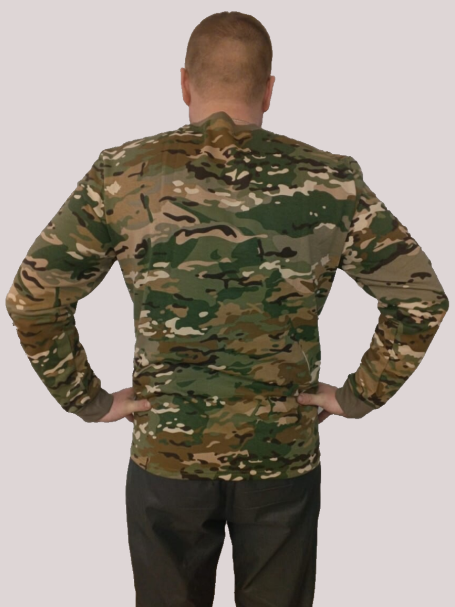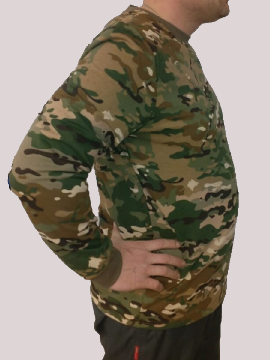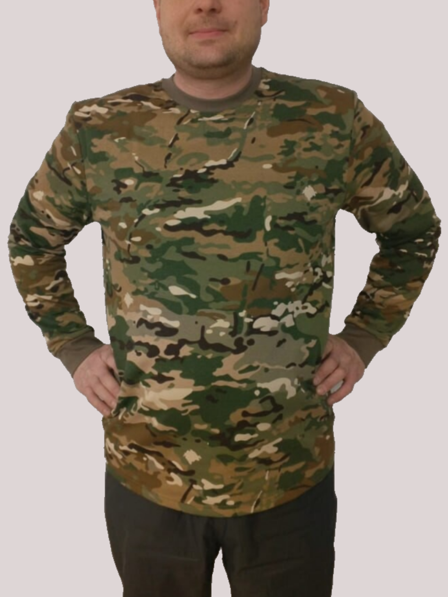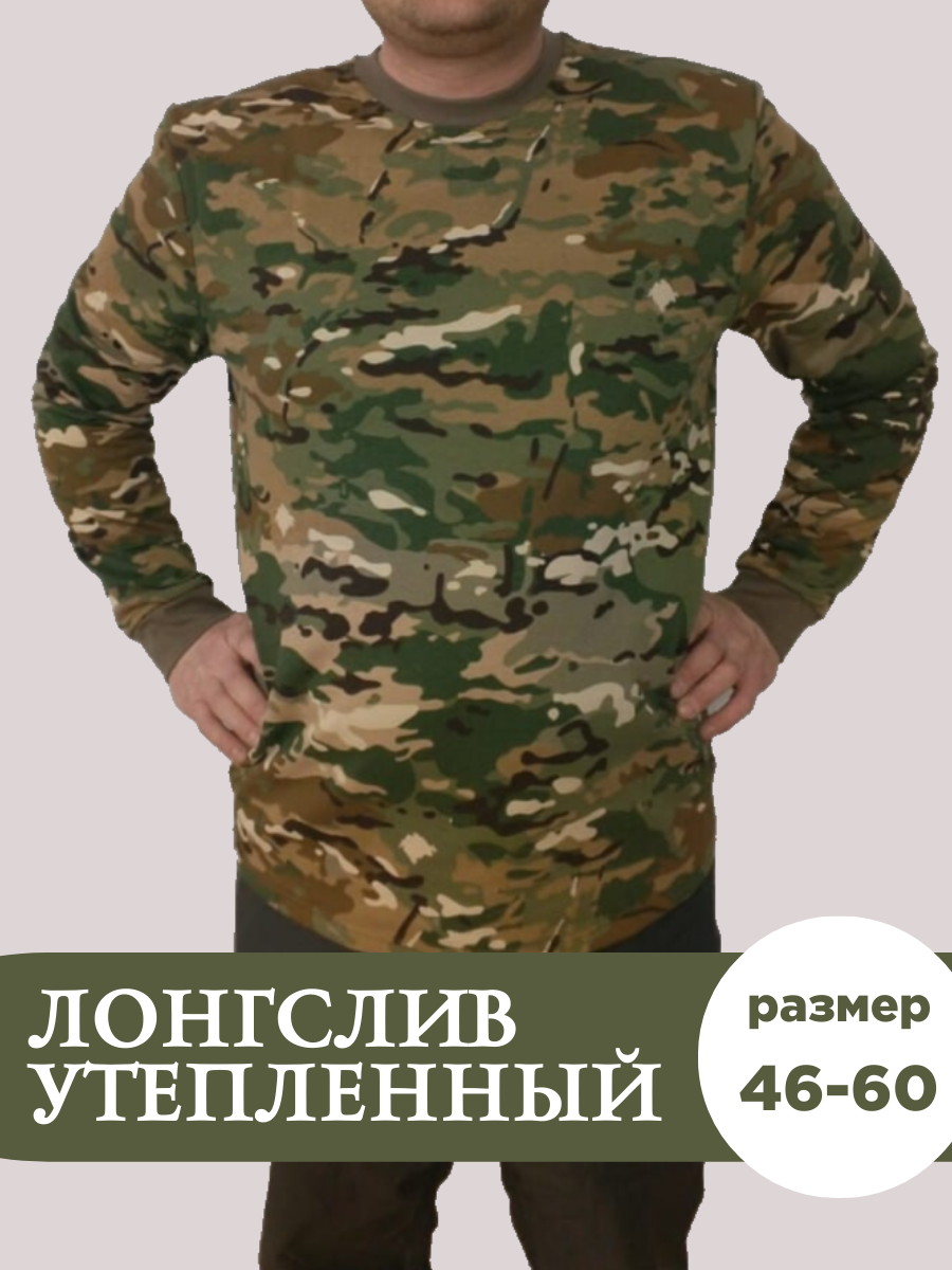 Мужской утеплённый лонгслив с начёсом. Расцветка - мультикам. Изготовлен из футер 2-х нитка с начесом на основе 100% хлопка. Плотность 180 гр/кв.м. Футер является гипоаллергенным материалом, обладает высокой воздухопроницаемостью и при этом отлично сохраняет тепло. Выполнена в классическом стиле. Подойдет на средний рост 170 - 176 см. Горловина имеет полукруглый вырез, оформлена трикотажной бейкой контрастного цвета. Рукава втачные, длинные с трикотажными манжетами. Ткань не даёт усадки после стирки, при правильном уходе. Устойчива к износу и долговечна. Лонгслив отлично дополнит демисезонную ветровку, брюки или зимний костюм.