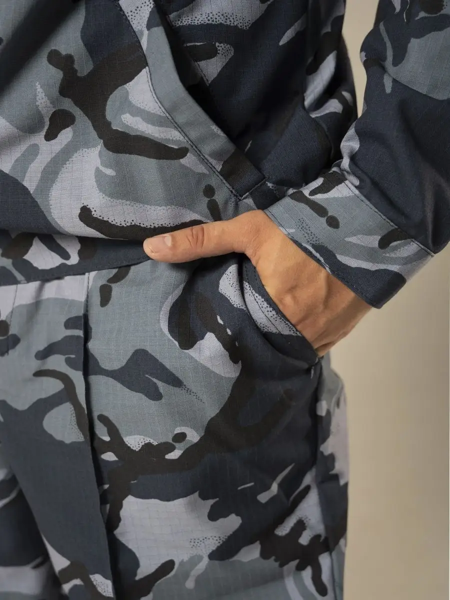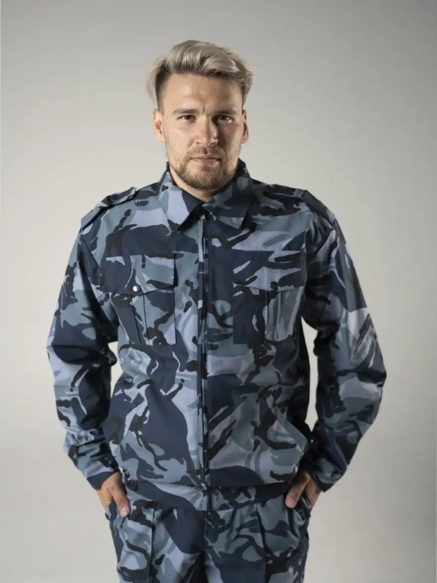Костюм камуфляжный уставной ФСИН, ткань рип-стоп, цвет синяя кукла. Водоотталкивающая пропитка, не позволяет ткани сразу промокать в кратковременную морось. Куртка: укороченная модель, центральная застёжка на тесьме-молнии, два нижних прорезных кармана, верхние накладные карманы прикрыты клапанами, один карман с клапаном на рукаве, рукав вточной на манжете, низ куртки на притачном поясе, по бокам стянут на эластичную тесьму. Брюки прямые, притачной пояс со шлёвками, два боковых кармана и два кармана на бедре с клапаном. Сзади прорубной карман с клапаном, отстроченные стрелки, тканевое усиление в области колена. Данный комплект возможно использовать, как сотрудникам ФСИН, так и в личных целях (туризм, поход, охота, рыбалка и т.д.). Обладает высокими показателями стойкости цвета и к истиранию, повышенной прочностью на разрыв.