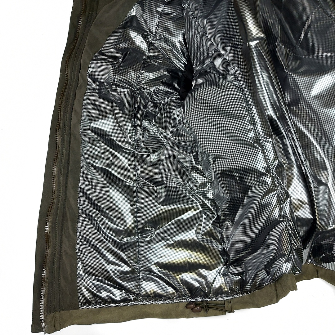 Подклад фольгированный - ткань из 100% полиэстеровых волокон с плетением тафета 210т, обработанная с одной стороны антибактериальным покрытием и ионами серебра, чтобы обеспечивать сохранение тепла путем его отражения от серебрянных точек.