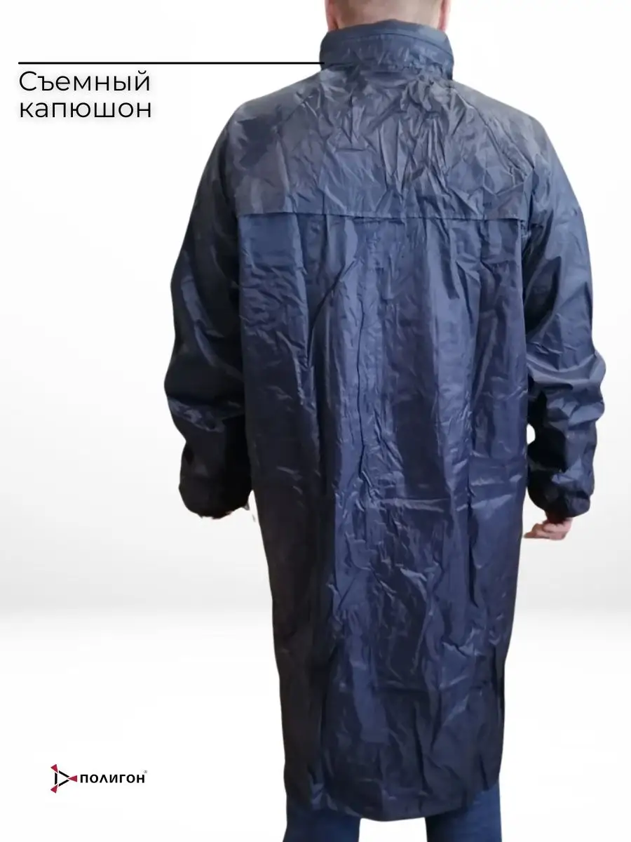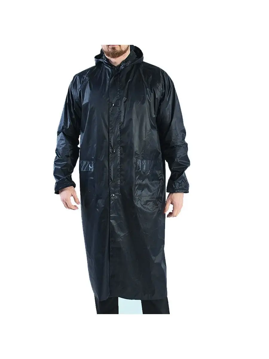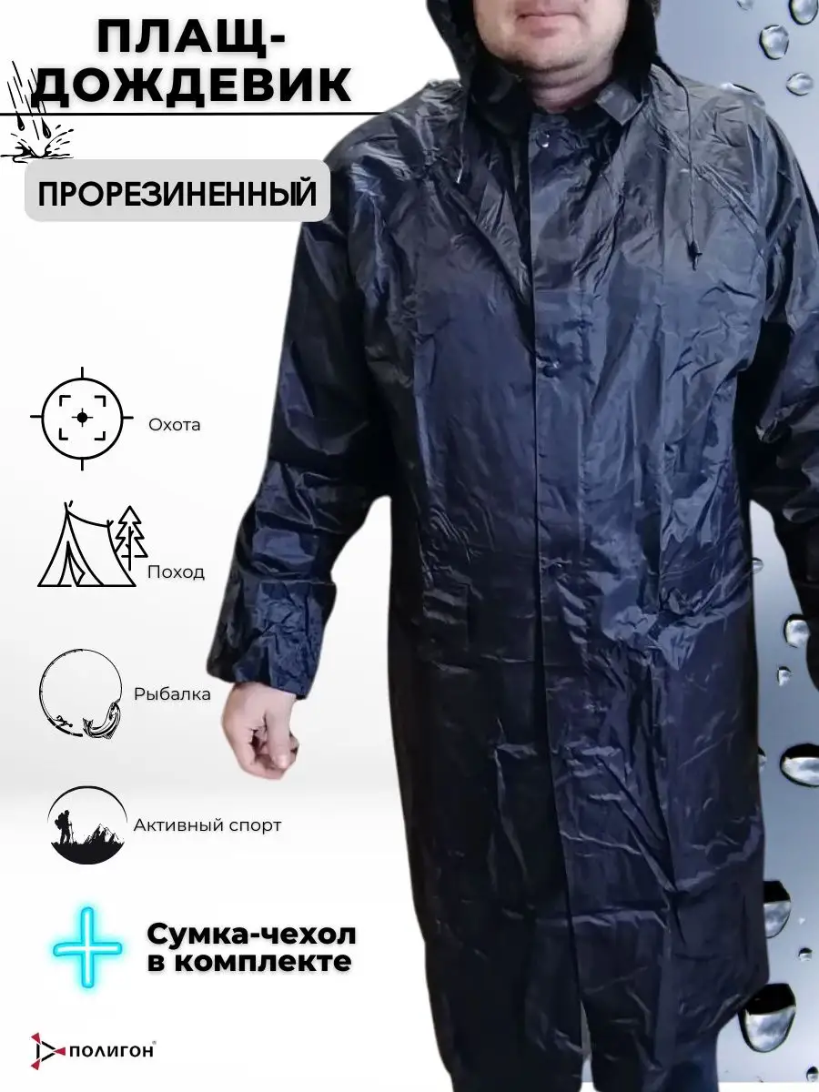 Прорезиненный дождевик из нейлонового материала лучший вариант для поездки на рыбалку. Длинный плащ будет полностью закрывать Ваши ноги от намокания. Утяжки на рукавах защитят от попадания дождя вовнутрь. Застежки молния и кнопки защитят от самового сильного ветра и дождя. Манжеты на резинке.  Состав ПВХ/полиэстер. На спине внизу кокетки вентиляционные вырезы. В районе подмышек отверстия вентиляционные. Капюшон с завязками. Сумка-чехол в комплекте.
