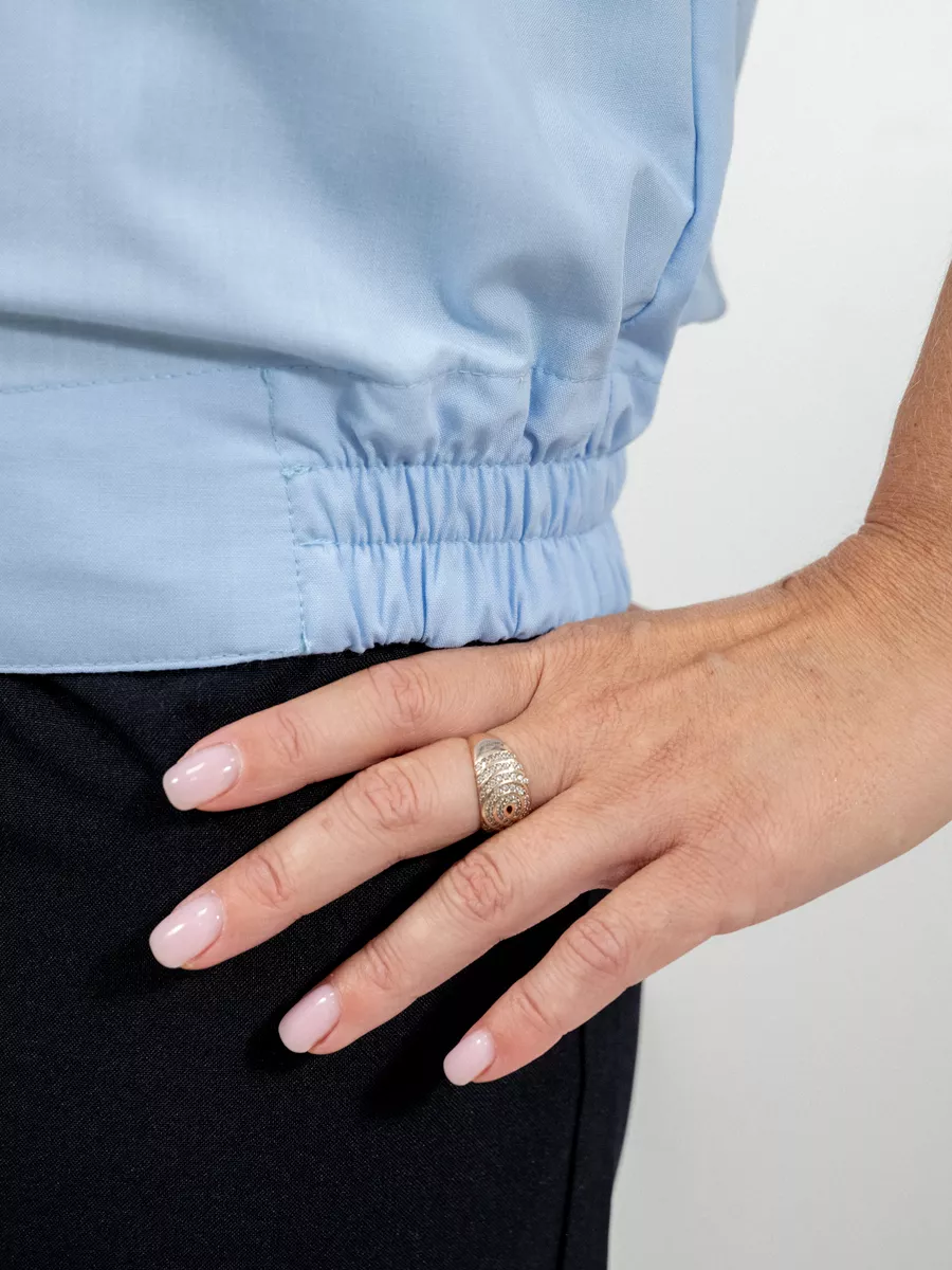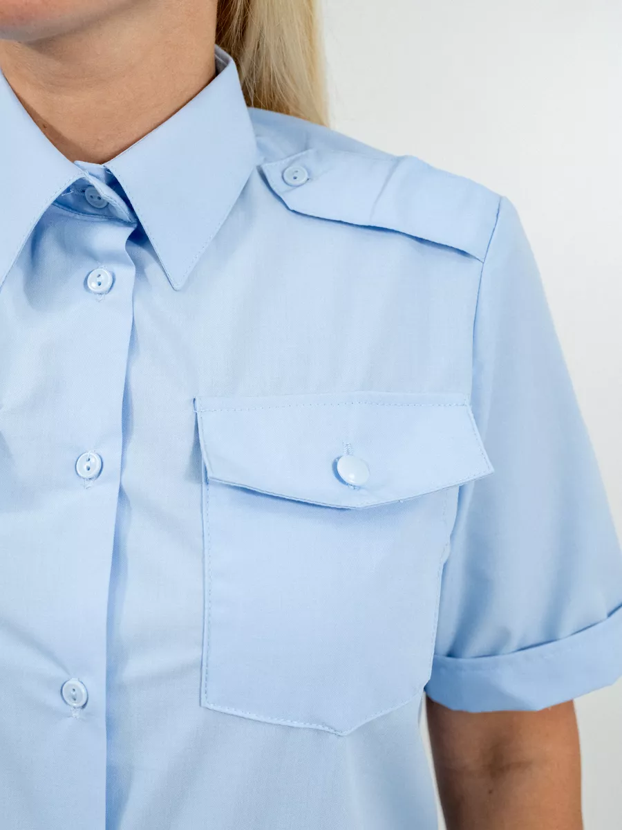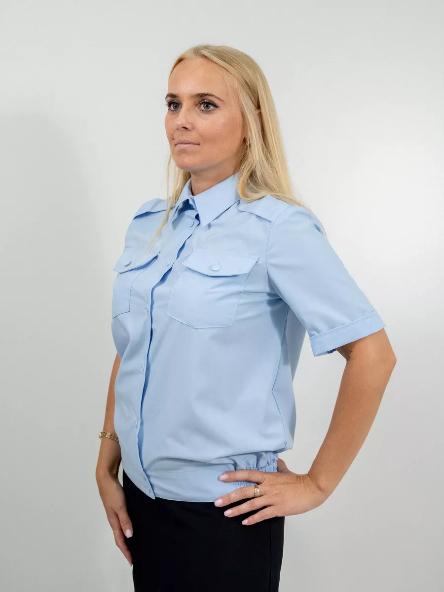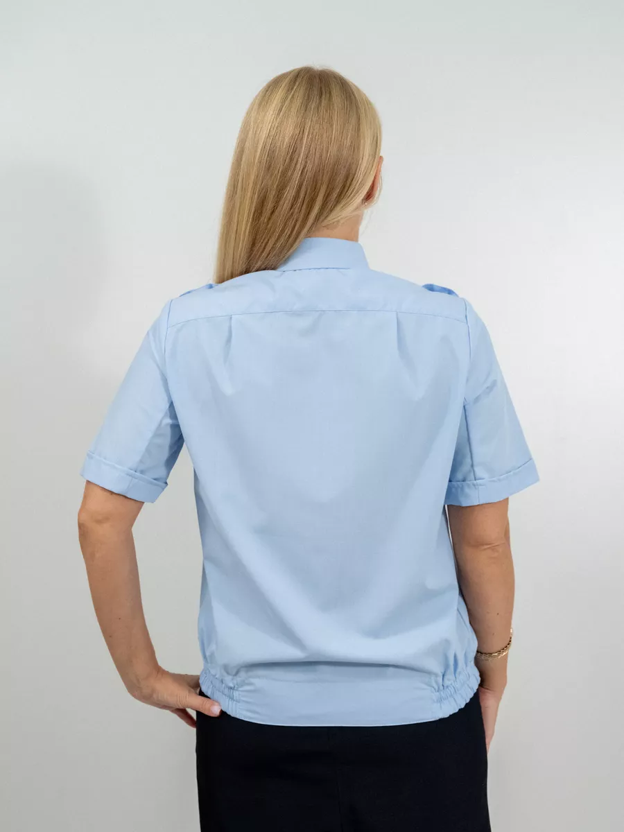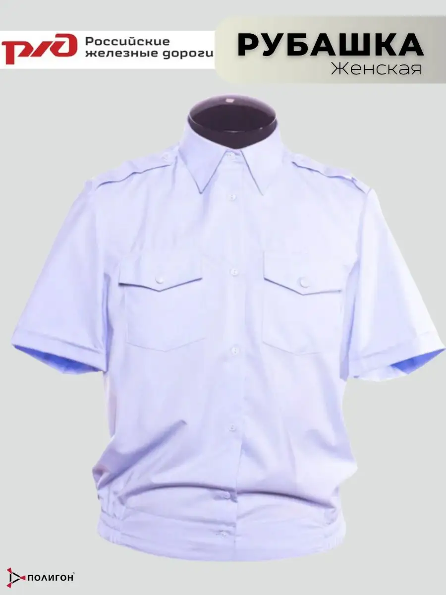 Рубашка РЖД бледно-голубая женская короткий рукав. Форменная, летняя рубашка, женская, РЖД. Голубая рубашка свободного кроя с центральной застёжкой на пуговицы, носится с форменными брюками на выпуск. Укороченная модель, внизу в области боковых швов вшиты эластичные ленты в два ряда. Они позволяют регулировать объем и придают аккуратный внешний вид изделию. Воротник отложной, классический, с притачной стойкой. Рукав короткий. На сорочке два накладных, нагрудных кармана, с фигурными клапанами, застегивающихся на пуговицу. Рубашка без шевронов и нашивок. Рубашка пошита из качественной сорочечной ткани (полиэстер-65%; вискоза-35%). Полиэстер отвечает за формоудержание, малоусадочность, прочность и долговечность изделия. Не выцветает на солнце, не портится из-за регулярных стирок. Отличается высокой стойкостью к истиранию, благодаря чему долго сохраняет аккуратный внешний вид. Сорочка РЖД «дышит», комфортна в течение носки. Рубашка уставная подходит для сотрудников РЖД (Российские железные дороги), проводников электропоездов, электричек, сотрудников поездов Сапсан, студентов или кадетов колледжа, школы РЖД. Цвет товара на экране зависит от освещения, настроек вашего устройства и партии товара, и может отличаться от реального.