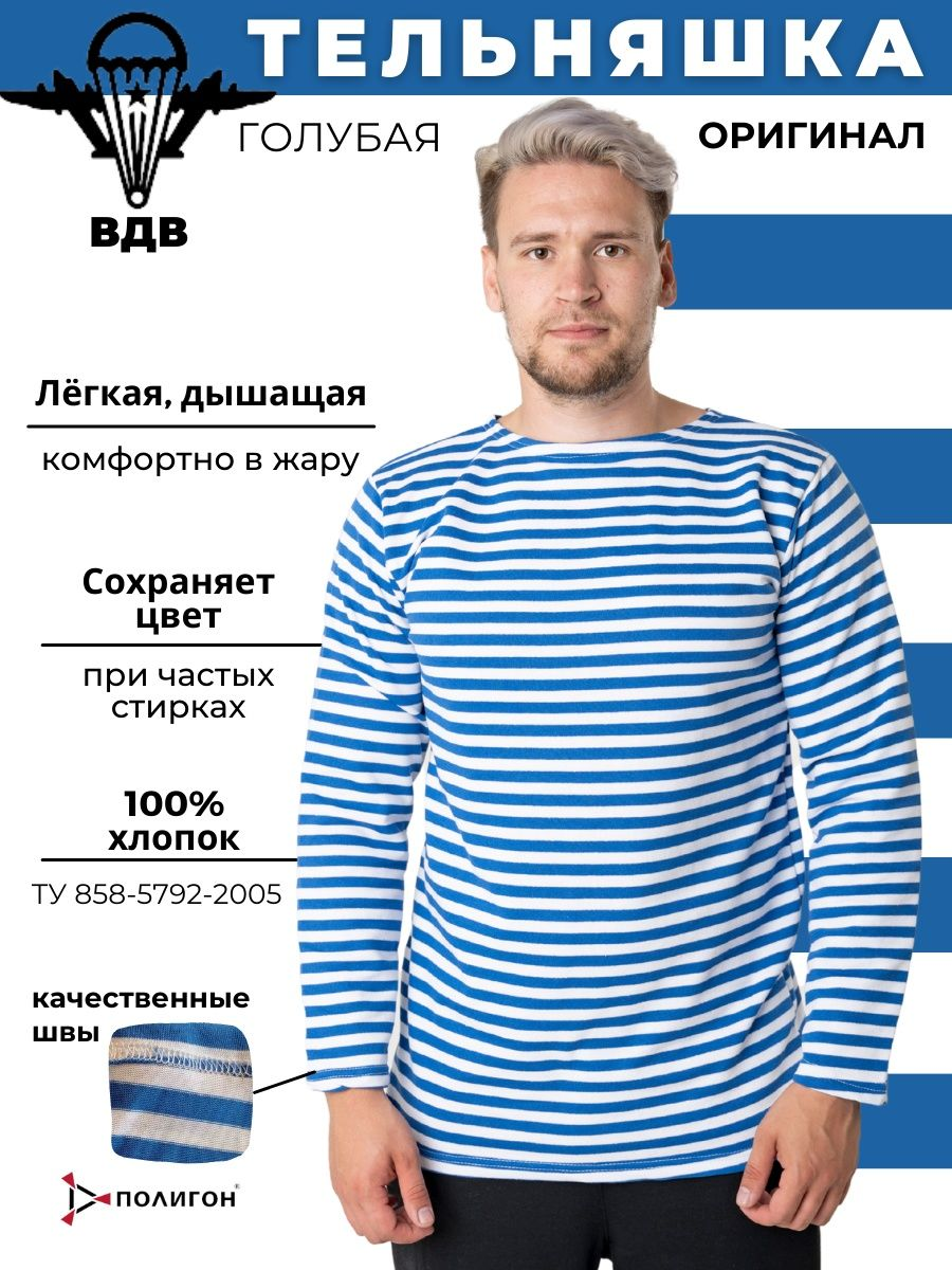 Тельняшка ВДВ - легкая, удобная, практичная в носке ткань, очень хорошо и приятно сидит на теле. Хлопок 100 %. Помимо использования в армии, пользуются большой популярностью у любителей туризма, охоты и рыбалки. Трикотажное полотно произведено из качественной пряжки класса А, благодаря чему конечный продукт получается отличного качества. Выполнена в соответствии с ТУ 858-5792-2005. Окрашена при помощи технологии активного крашения, благодаря чему изделие сохраняет свой цвет даже после частых стирок. Данная модель хороша тем, что в ней приятно заниматься спортом, активно двигаться, отдыхать, работать, ведь благодаря "дышащим" свойствам хлопка, влага не задерживается и выводится через микропоры трикотажа, где благополучно выветривается и сушится. Благодаря относительно небольшой плотности трикотажа, данную модель тельняшки можно носить даже в сильную жару, не смотря на длинный рукав. Тельняшка изготавливается с одинаковым вырезом горловины, как спереди, так и сзади, что позволяет одеть ее на любую сторону. Возможность одевать под рубашку и другие вещи.