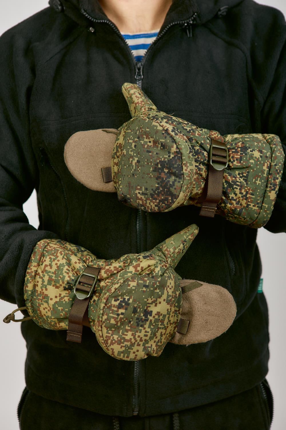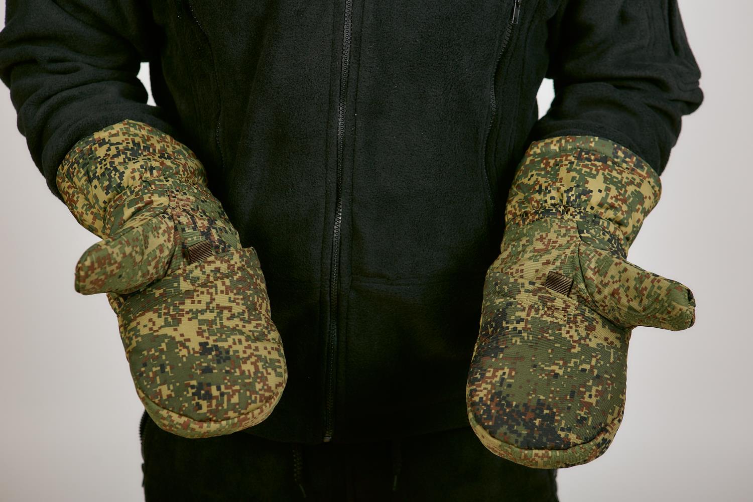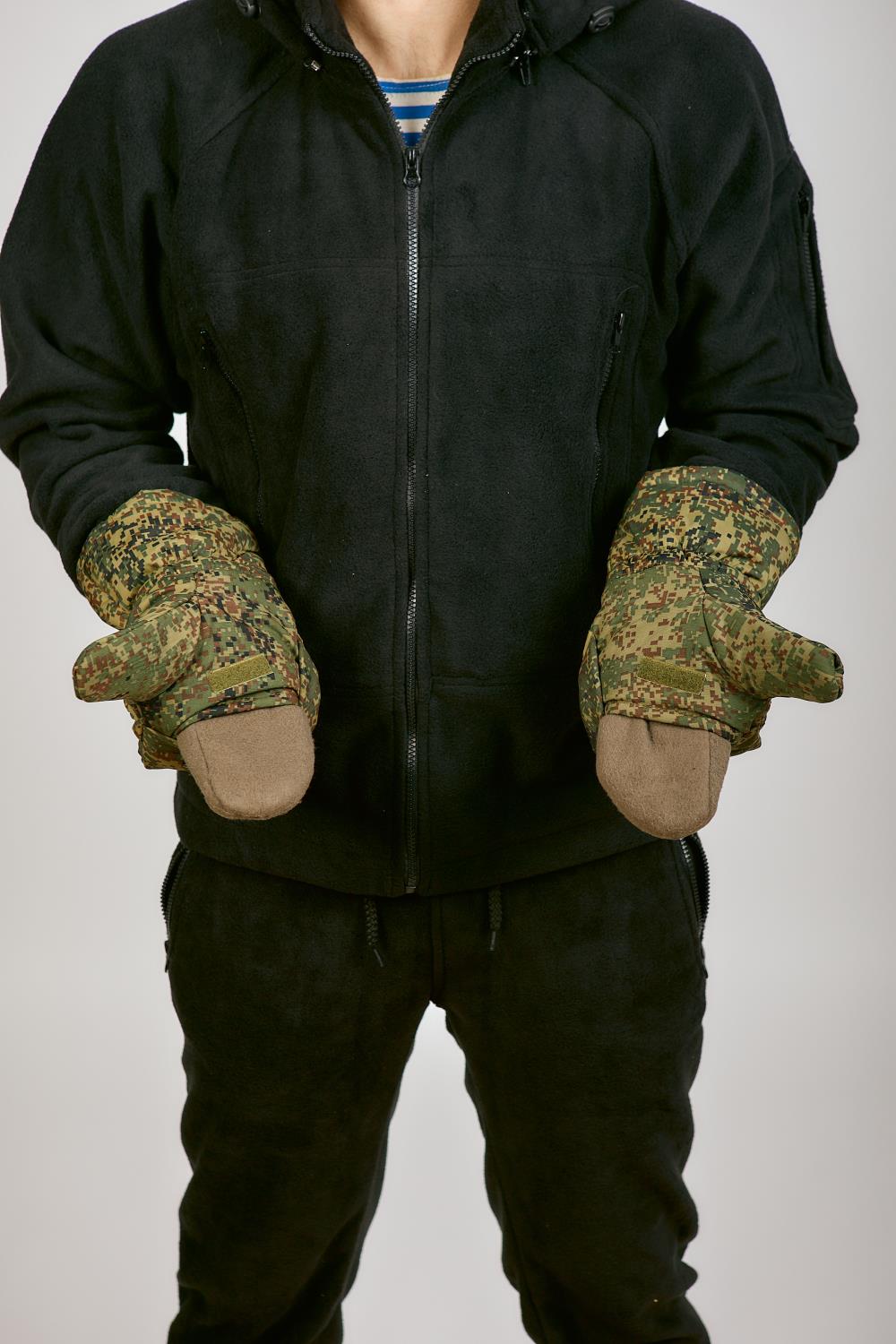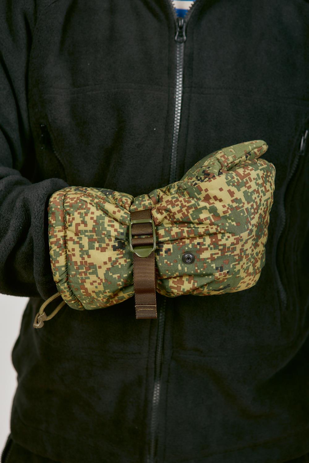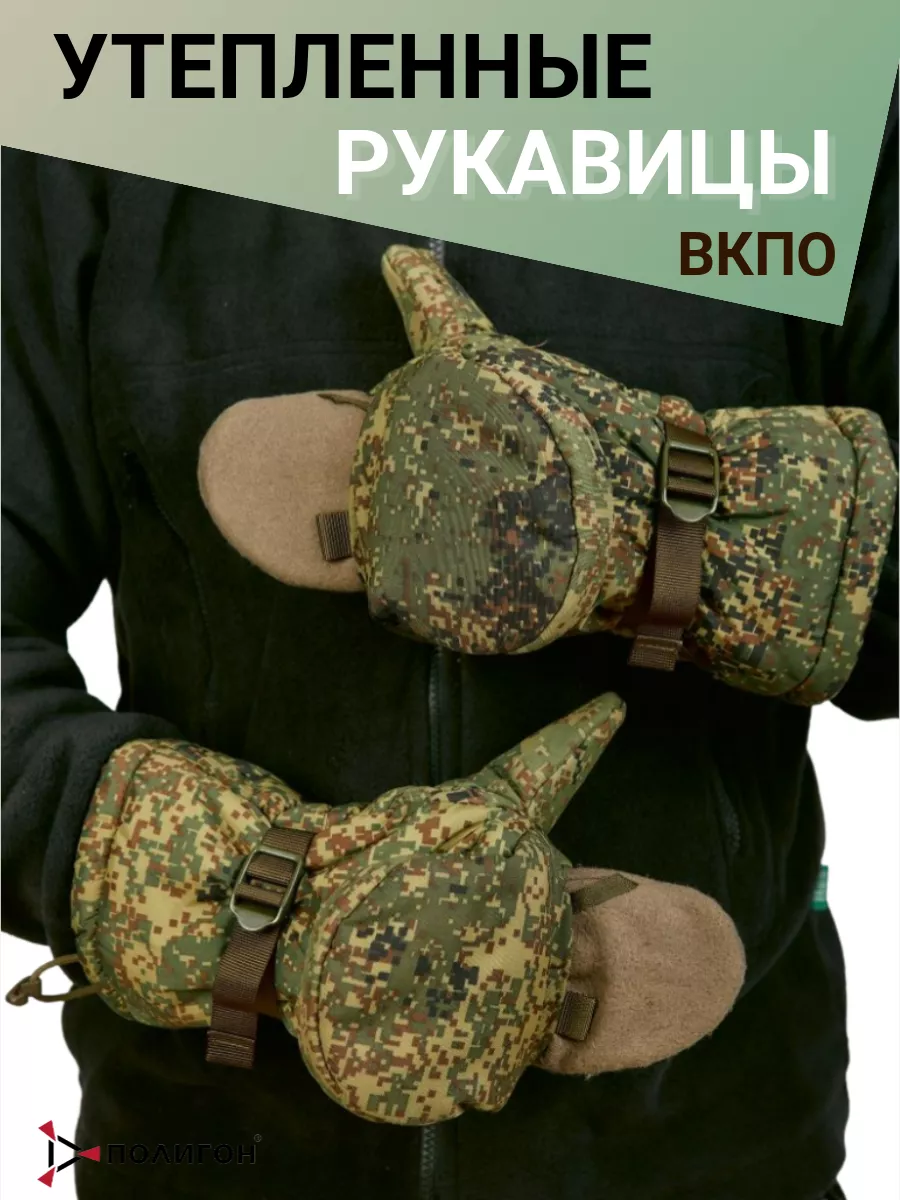 Рукавицы утепленные ВКБО, ВКПО цвет зеленая цифра. Используются для ношения в зимнее время года. Для качественной фиксации варежки на руке имеется утягивающая стропа с пластиковым фиксатором и утягивающий шнур с фиксатором. Зафиксировать варежку легко даже в рукавице. Уставные армейские ВКБО рукавицы утепленные носят от 5 до -40 градусов. Внутренняя сторона ладони и большого пальца изготовлены из перчаточной кожи. Остальной материал идентичен той же ткани, что и на зимнем комплекте ВКБО. Материал не промокает и дышит. Также на рукавицах имеется специальный крючок, с помощью которого можно сцепить перчатки между собой или зацепить за петли на рукавах. Внутри имеется дополнительный съемный утеплитель из одностороннего флиса, внутри он крепится на липучке. Для удобства стрельбы на морозе Вы можете сами заменить его на флисовые перчатки, при этом рукавицы не теряют свое назначение-утепление. Рукавицы ВКБО мужские износостойкие и прослужат Вам долгую службу.