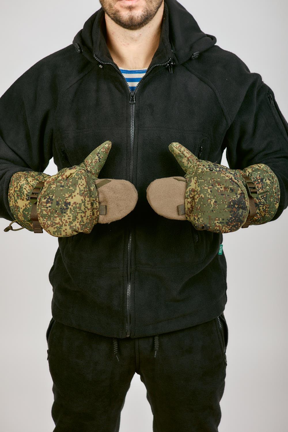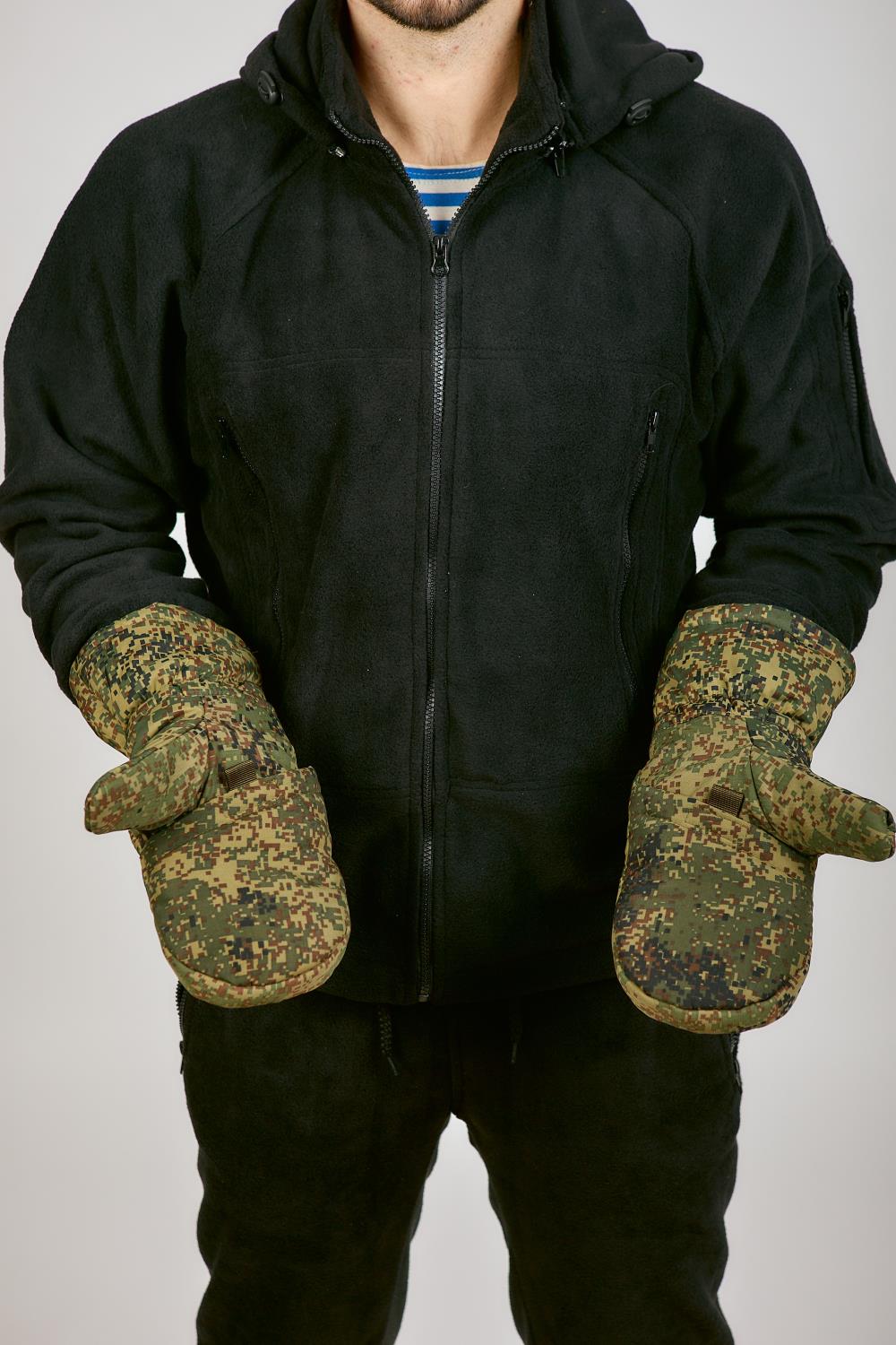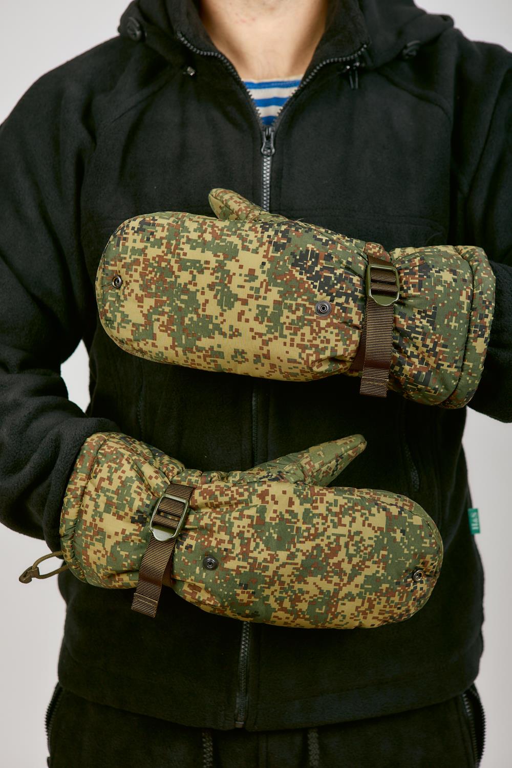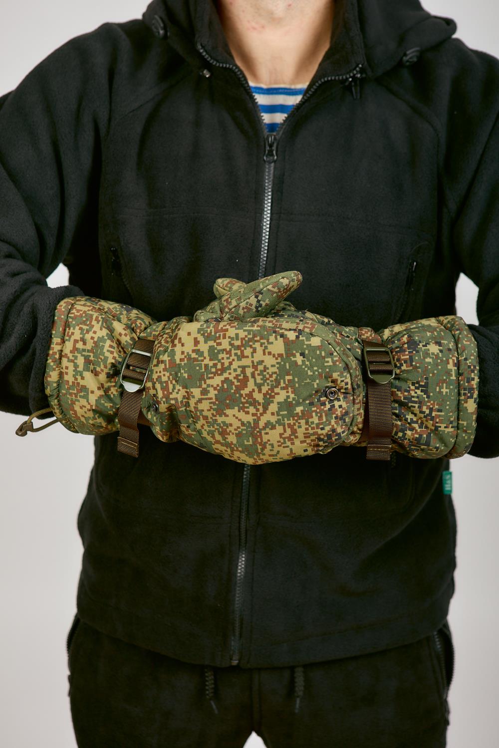 Рукавицы утепленные ВКБО, ВКПО цвет зеленая цифра. Используются для ношения в зимнее время года. Для качественной фиксации варежки на руке имеется утягивающая стропа с пластиковым фиксатором и утягивающий шнур с фиксатором. Зафиксировать варежку легко даже в рукавице. Уставные армейские ВКБО рукавицы утепленные носят от 5 до -40 градусов. Внутренняя сторона ладони и большого пальца изготовлены из перчаточной кожи. Остальной материал идентичен той же ткани, что и на зимнем комплекте ВКБО. Материал не промокает и дышит. Также на рукавицах имеется специальный крючок, с помощью которого можно сцепить перчатки между собой или зацепить за петли на рукавах. Внутри имеется дополнительный съемный утеплитель из одностороннего флиса, внутри он крепится на липучке. Для удобства стрельбы на морозе Вы можете сами заменить его на флисовые перчатки, при этом рукавицы не теряют свое назначение-утепление. Рукавицы ВКБО мужские износостойкие и прослужат Вам долгую службу.